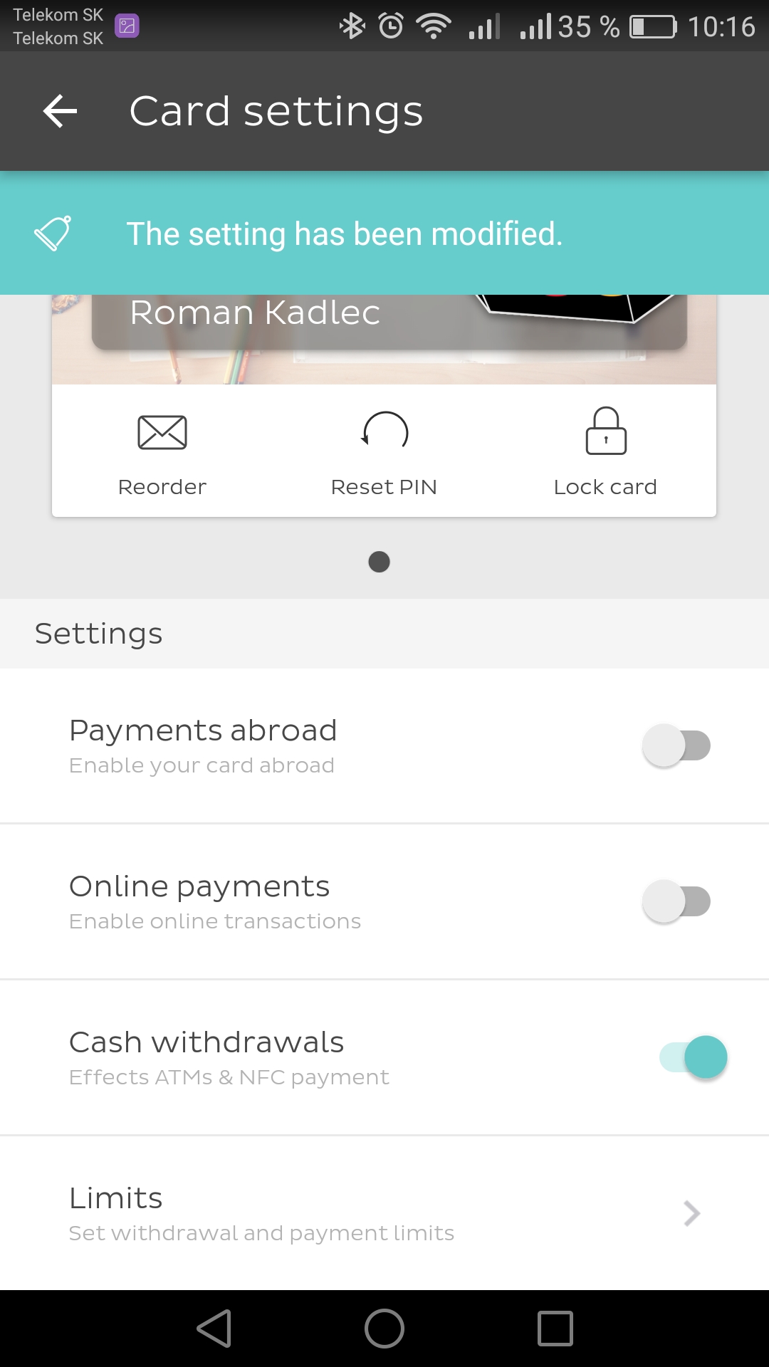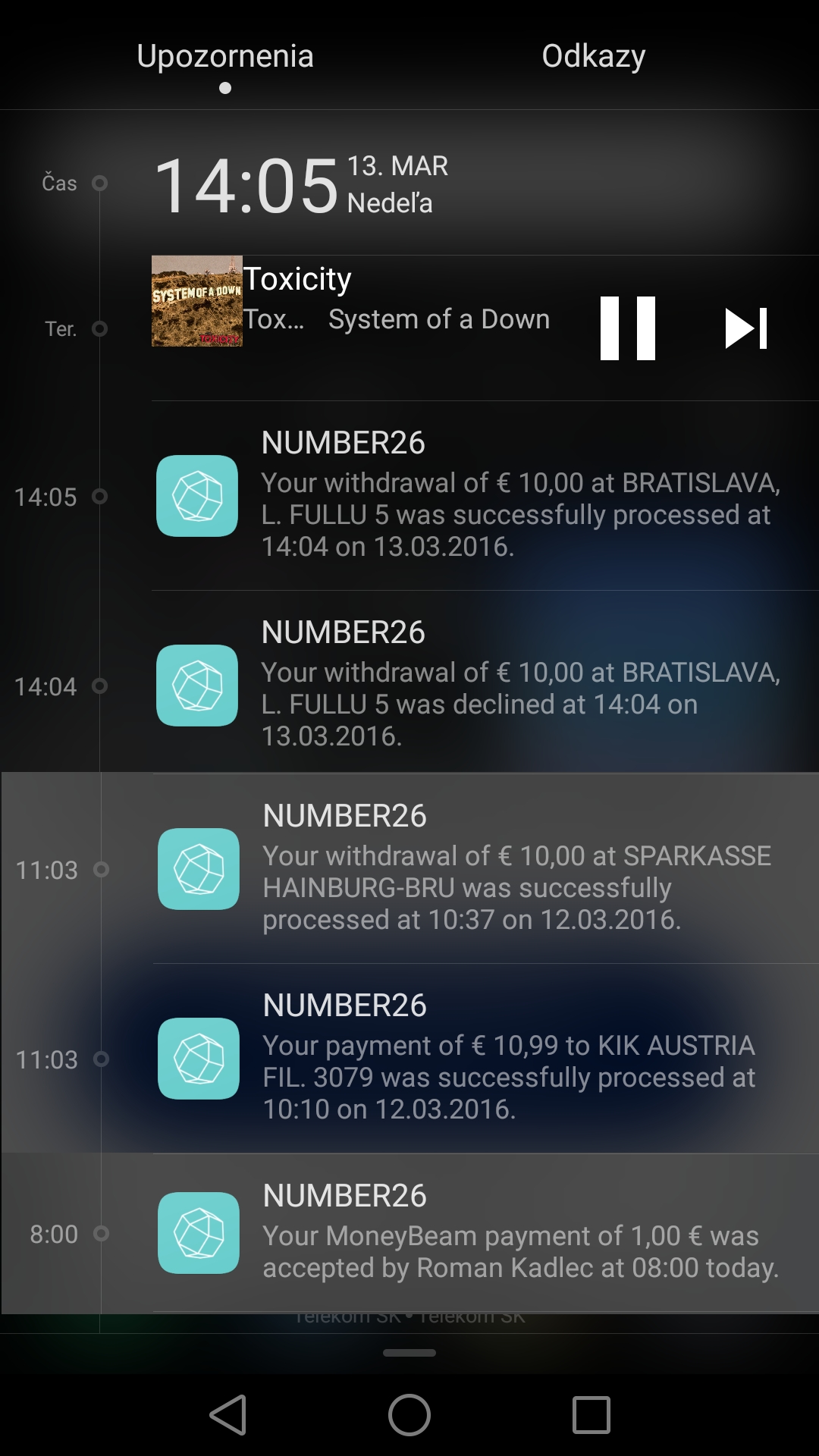 NUMBER26 s výnimkou autorizácie smartfónu nevyužíva SMS správy. O aktivite vášho účtu vás informuje okamžitými notifikáciami aplikácie a prípadne aj pomocou emailov. Nastavíte si, v akých situáciách sa má poslať upozornenie. Toto riešenie má svoje výhody aj nevýhody. Nevýhodou je, že ak nemáte pripojenie do mobilného internetu, notifikáciu dostanete až pri najbližšom pripojení do internetu. Toto sa v prípade SMS notifikácií nestane. Takisto si treba dať pozor na nastavenie šetriča batérie v prípade systému Android, ktorý môže aplikáciu obmedzovať v posielaní notifikácií v reálnom čase.