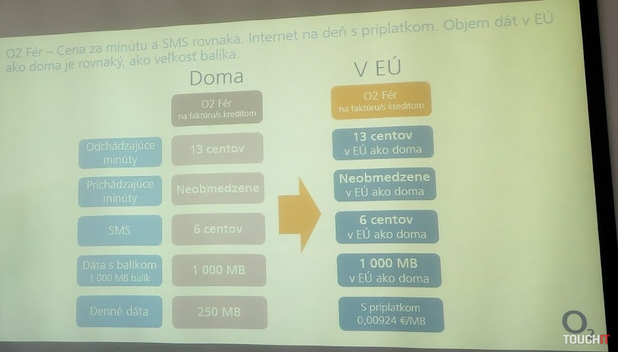 O2 Paušál: Môžete využívať všetky minúty, SMS a dáta doma aj v EÚ bez príplatkovO2 Dáta: V rámci služby O2 Dáta sú ceny za minútu hovoru aj SMS rovnaké doma aj v EÚ. V prípade dátových balíčkov je časť dát dostupných v EÚ bez príplatku, viď. tabuľkaO2 Fér: Aj O2 Fér má všetky ceny rovnaké doma a v EÚ. Dátové balíčky je možné využívať bez príplatkov aj v EÚ. Výnimkou je Denný internet, kde sa účtuje príplatok za 1 MB, avšak od 3. júla až po prečerpaní viac ako 125 MB dát za deň.O2 FérZhrnutie