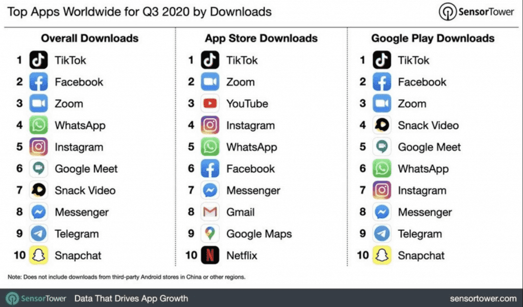 Pokiaľ sa pozrieme na to, ako sa darilo jednotlivým aplikáciám, vo všetkých prípadoch išlo o jednoznačného víťaza. Čínska aplikácia TikTok sa v 3. kvartáli stala najsťahovanejšou na platformách iOS a Android. Pomerne populárne sú však aj ďalšie aplikácie ako Facebook, Zoom, WhatsApp a Instagram. TikTok bol v poslednej dobe pod drobnohľadom. Spoločnosť v USA čelila plošnému zákazu, v dôsledku čoho dosiahla dohodu so spoločnosťami Oracle a Walmart.