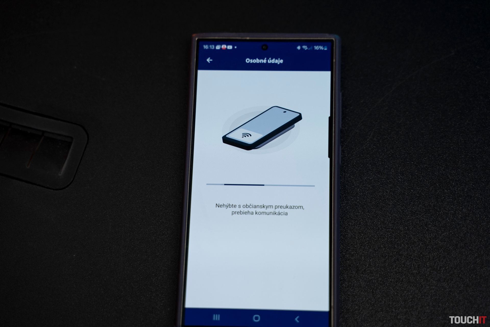 Z aplikácie vyberte položku Aktivovať MeID a teraz potrebujete vedieť, kde sa nachádza NCF čítačka vo vašom mobilnom telefóne. Postupne prechádzate občianskym preukazom po zadnej časti telefónu až pokým nebudete počuť zvuk načítania čipu. Pre Samsung sa NFC čítačka nachádza na zadnej strane v hornej časti, preto priložte fyzickú eID kartu čipom k hornej zadnej hrane telefónu napr. pod 45° uhlom. Podobne funguje aj iPhone. Telefónom ani svojím dokladom už po nadviazaní prepojenia nehýbte. Takto sa vytvorí MeID prístupový kľúč (passkey), ktorý bude potrebovať aplikácia eDoklady.