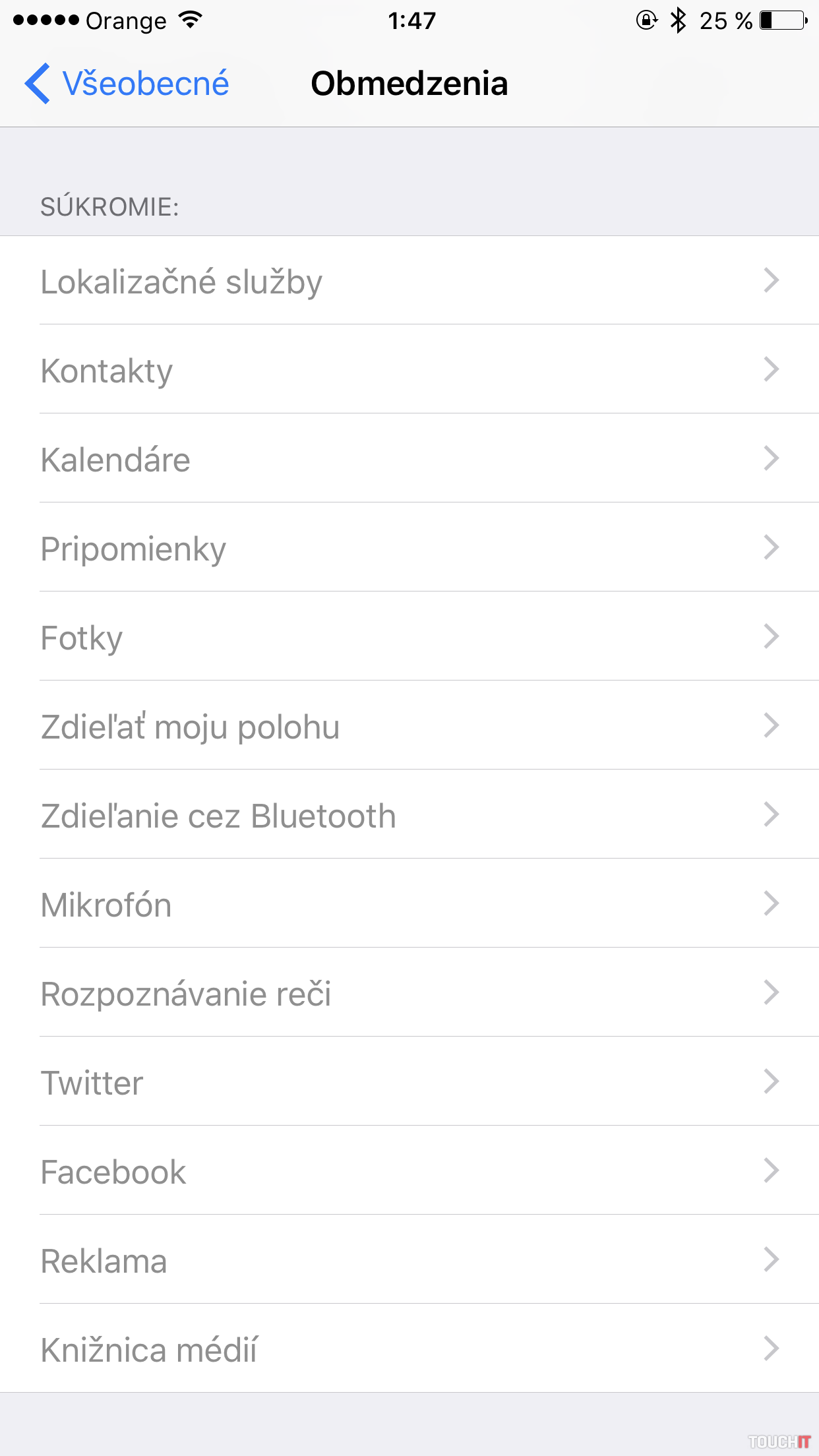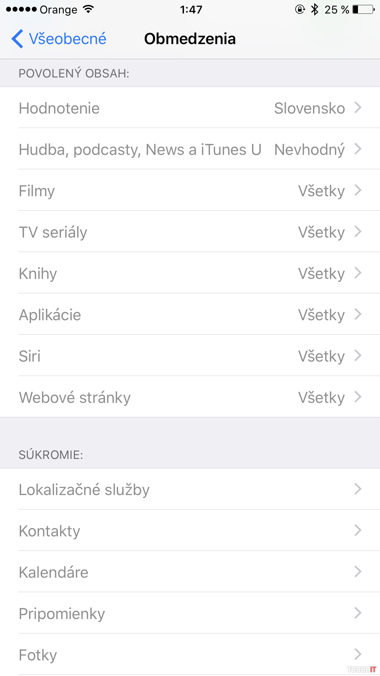 Ďalším odsekom je súkromie, kde sú viaceré možnosti zákazov na vykonávanie zmien v dôležitých položkách – kalendár, kontakty, pripomienky, fotky, Facebook, kontá, mikrofón, zdieľanie cez Bluetooth a pod. Osobne sa mi najviac páči možnosť zákazu zmien v lokalizačných službách a mobilných dátach. To znamená, že ak chcete mať dieťa pod úplným dohľadom, vždy budete vedieť kde sa nachádza (pomocou Find my iPhone a pod.), pričom samo dieťa nastavenú konfiguráciu zmeniť nemôže (jedinou možnosťou je vypnutie telefónu). Práve táto možnosť nám v tejto funkcionalite, ako aj v celom iOS podstatne chýba – zákaz vypnutia zariadenia chránený heslom.