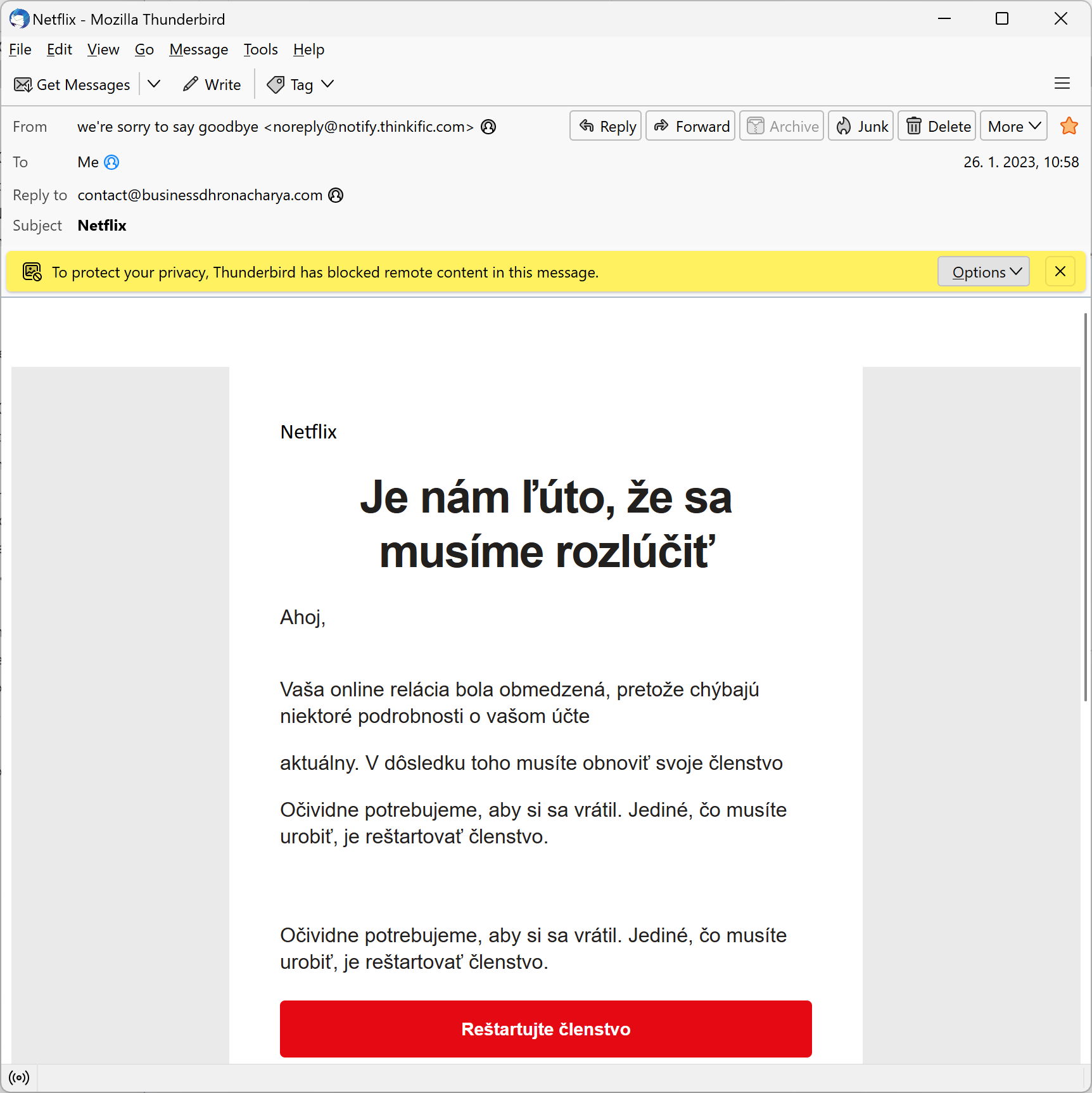 Z hlavičky emailovej správy vidno, že ide o podvod. Emailová adresa noreply@notify.thinkific.com určite nebude patriť spomínanej službe. Buďte obozretní pri podvodoch tohto typu, vždy cielia na vašu nepozornosť a strach, že vám bude nejaká služba obmedzená a rýchlo treba vykonať podvodníkmi navrhovanú akciu.
