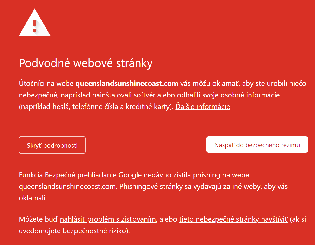 To znamená kliknúť na tlačidlo v emailovej správe na otvorenie falošnej stránky. Prehliadač ju zablokuje s upozornením, že ide o podvod, nesnažte sa na ňu dostať ďalej.