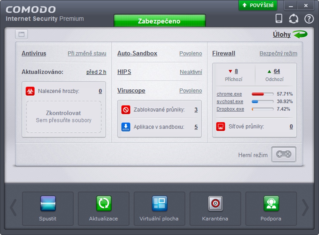 COMODO Internet Security Premium je úplne zadarmo a obsahuje okrem antivírusu a firewallu aj ďalšie moduly. Sústreďuje sa na ochranu internetových platieb a maximálnu informovanosť používateľov. Sledovať tu môžete všetko od bežiacich procesov až po protokoly a tok dát prostredníctvom nich. Spúšťanie programov vo virtuálnom režime je vhodné pre tých, čo na internete radi špekulujú.