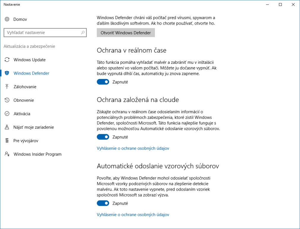 Windows Defender vo Windows 10