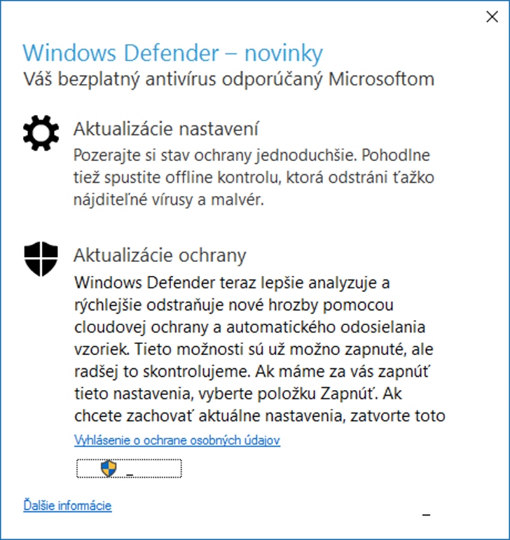 Aktualizácia programu prebieha cez službu Windows UpdatePrvé zapnutie programu Windows Defender zobrazí novinky z výročnej aktualizácie Windows 10 pre tento programNastavenia sa po novom presunuli do okna nastavení pre celý operačný systémNastavenia sa po novom presunuli do okna nastavení pre celý operačný systém