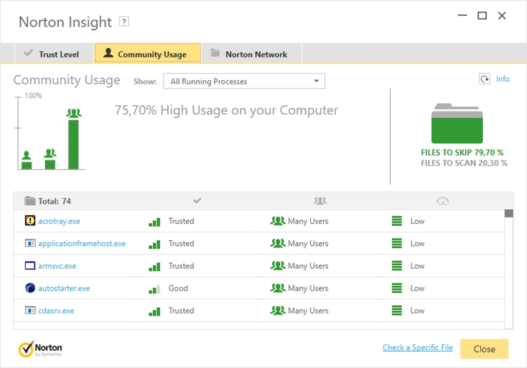 Aplikácia dosahuje minimálne systémové nároky aj vďaka správe aplikácií a súborov, ktoré netreba kontrolovať. Preto ani nie je predlžované spúšťanie programov po nainštalovaní tohto bezpečnostného riešenia. Norton Insight je funkcia vyhľadávajúca známe a neznáme aplikácie a procesy. Na základe svojej databázy určuje, ktoré z nich sa budú pri spustení kontrolovať, a ktoré nie. Je to vskutku užitočné riešenie. Ak si pamätáte Norton AntiVirus spred desiatich rokov ako poriadneho žrúta výkonu, toto už dnes neplatí. Kontrola spolupracuje so servermi výrobcu a tam si hľadá informáciu o súboroch pre každú verziu. Akonáhle by sa niekto snažil pod rovnakým menom spustiť podobný súbor, program to zachytí. Jednotlivé EXE súbory musia byť zhodné na verziu presne. Zároveň vidíte v okne vlastnosti súboru. To je pre používateľa užitočné. Ak totiž neviete, čo je to za súbor, máte možnosť si pozrieť jeho reputáciu na základe toho, či je bezpečný a koľko používateľov ho má. Ak zistíte, že ho má veľké množstvo používateľov, nebudete sa obávať. S najväčšou pravdepodobnosťou pôjde o súčasť legitímneho programu.