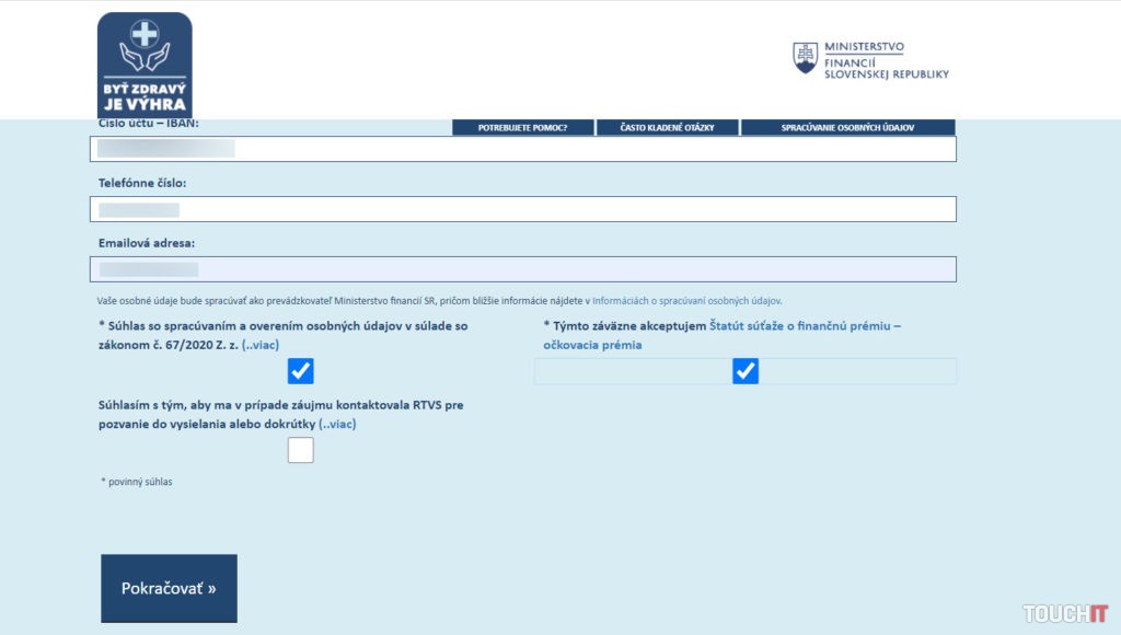 Pri registrácii uvádzate svoje meno, priezvisko, bydlisko, rodné číslo, telefonický kontakt a tiež číslo účtu na vyplatenia prípadnej výhry. Na záver ešte súhlasíte so spracovaním vašich osobných údajov Ministerstvom financií SR, súhlasíte s akceptovaním štatútu súťaže a prípadne budete súhlasiť s vašim pozvaním do RTVS (to nie je povinné).