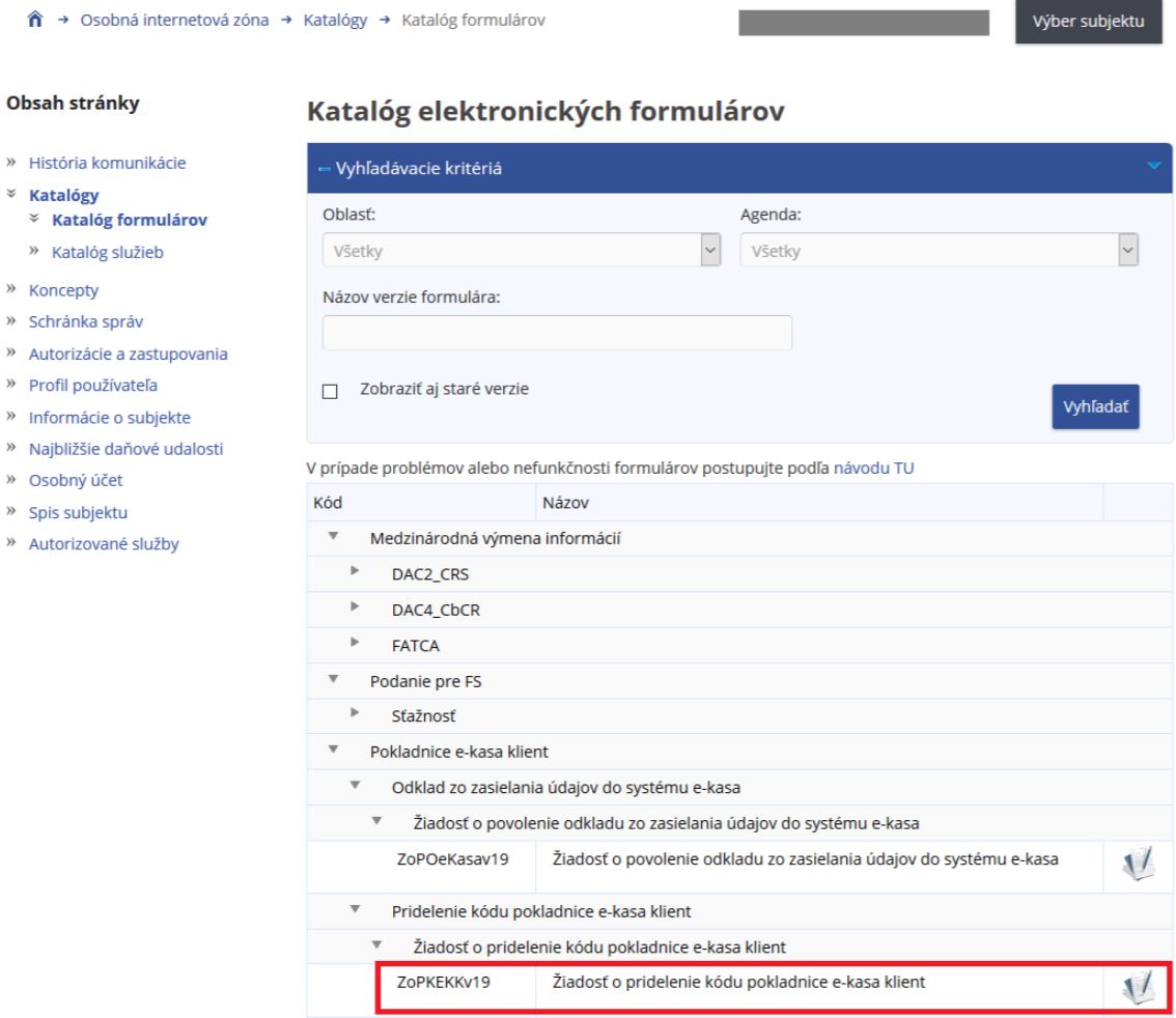 O autentifikačný a identifikačný balíček je potrebné požiadať na portáli finančnej správy v rámci vašej Osobnej internetovej zóny (OIZ). Vyberte časť „formuláre“ a vyplňte a odošlite elektronický formulár „Žiadosť o pridelenie kódu pokladnice e-kasa klient“. V žiadosti označte, že žiadate o pridelenie kódu online registračnej pokladnice.