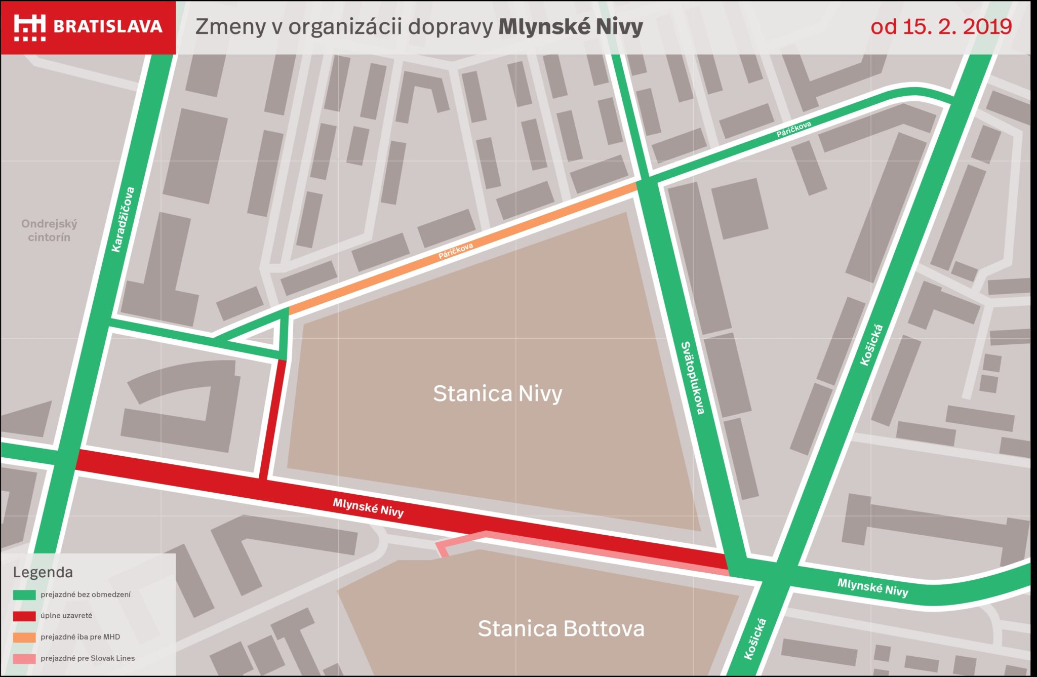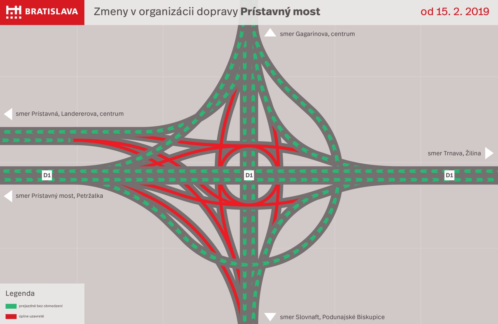 Od 15. februára bude na pol roka kompletne uzavretá ulica Mlynské nivy a niektoré zjazdy z Prístavného mosta smerom na Slovnaft a Prístavnú ulicu, čo bude mať veľmi negatívny dopad na dopravu v celej východnej časti Bratislavy. Najväčší nápor na dopravu a nárast dopravy sa predpokladá na Gagarinovej ulici a na Landererovej ulici, ktoré sú zároveň aj obchádzkovými trasami.