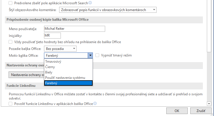 Nové úpravy majú podporu čiernej témy. Rozšírené možnosti nájdete v menu Súbor – Možnosti v časti Motív balíka Office. Naše skúsenosti ukazujú, že nie všetko funguje hneď po aktualizácii. Na to, aby sa zmena uplatnila, je treba aplikácie zapnúť a vypnúť a až potom robiť ďalšie úpravy.