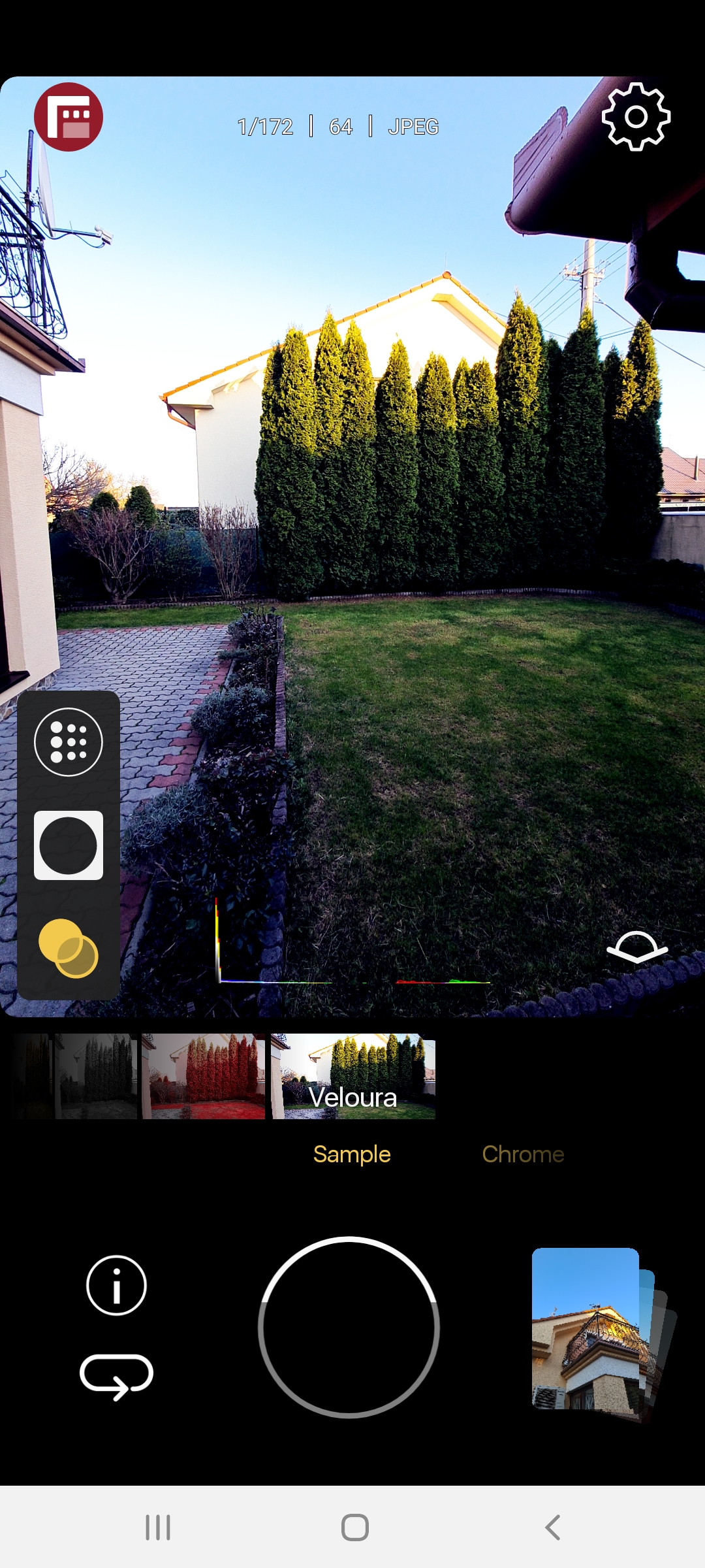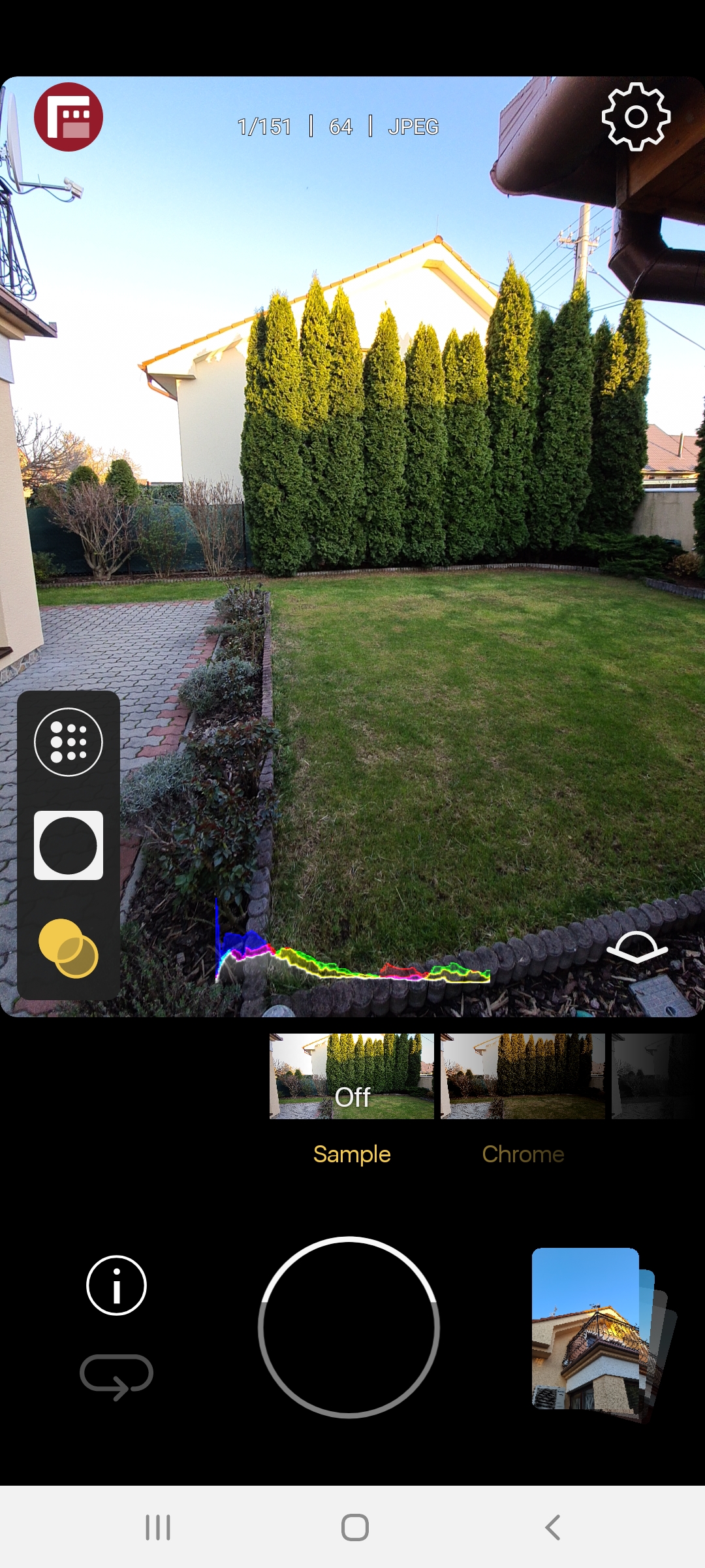 Zaostrenie a expozíciu fotky s Firstlight môžete nezávisle nastaviť pohybom prsta po displeji. Pohyb prsta doľava a doprava mení zaostrenie. Pritom zvýraznenými zeleným hranami veľmi dobre vidíte, kedy je ten správny okamih zaostrenia. Pohyb prsta smerom hore a dole na displeji zase mení expozíciu a opäť viete presne nastaviť to, čo chcete. Všetko sa mení v reálnom čase. Pritom máte pred očami neustále sa meniaci histogram RGB, ktorý sa dynamicky aktualizuje podľa toho, ako meníte expozíciu. Zebra vám zase zobrazuje okamihy zaostrenia – takto to býva v profesionálnych foťákoch a kamerách. Obľúbil som si aj šikovnú funkciu lupa. Klepnete niekde prstom po displeji a prst podržíte. Zobrazí sa pritom krúžok so zväčšeným pohľadom na fotografiu. Teda máte ešte lepší pohľad na to, čo je dôležité vo fotografii a takto aj presnejšie zaostríte. Ďalší ovládací prvok potom prepína medzi dostupnými prednými a zadnými fotoaparátmi na vašom zariadení. Ja som skúšal Firstlight na telefóne Samsung Galaxy S20 Ultra a tu sa dalo fotiť dvoma zadnými a dvom prednými fotoaparátmi. Evidentne Samsung nepustil FiLMiC k rodinnému striebru, teda k Nočnému režimu, lebo v noci pri tomto programe nič také nemôžete využiť. So štandardnou aplikáciou pre telefón však stále áno.Ďalšie možnosti