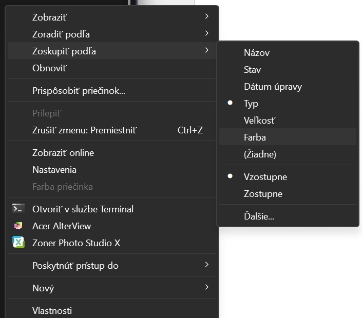Vrátenie zmien prebieha rovnako, no chýba položka „bez farby“. Priečinok v systéme má vždy nejakú farbu, tu konkrétne žltú. Na návrat späť bude potrebné vybrať žltú farbu. Jednoduchý trik, ako si rozlíšiť priečinky s rôznym obsahom podľa farby. Triedenie na základe farby zatiaľ nie je možné. Kontextové menu sa dá upraviť, aby do výberu kritérií pribudla práve položka Farba, to sa ale netýka priečinkov ale obrázkov.