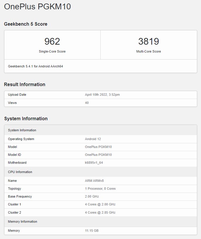 Avšak aj pripravovaný telefón od OnePlus dosiahol na platforme Geekbench vskutku dobré bodové hodnotenie. V jednojadrovom teste to bolo 962 bodov a vo viacjadrovom 3 819 bodov. Na základe testov sme získali aj ďalšie technické parametre, ktoré zahŕňajú spomínaný čipset Dimensity 8100, 12 GB RAM a Android 12.