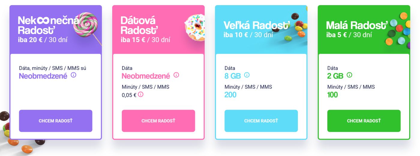 - Malá Radosť za 5 eur – 100 minút/SMS/MMS + 2 GB dát rýchlosťou 10/10 Mbps (v EÚ môžete využiť bez príplatku 4,6 GB dát). Po minutí predplatených dát sa automaticky aktivuje 1 GB balíček za poplatok 2 eurá, resp. za minútu hovoru, SMS a MMS nad rámec predplateného objemu zaplatíte 5 centov