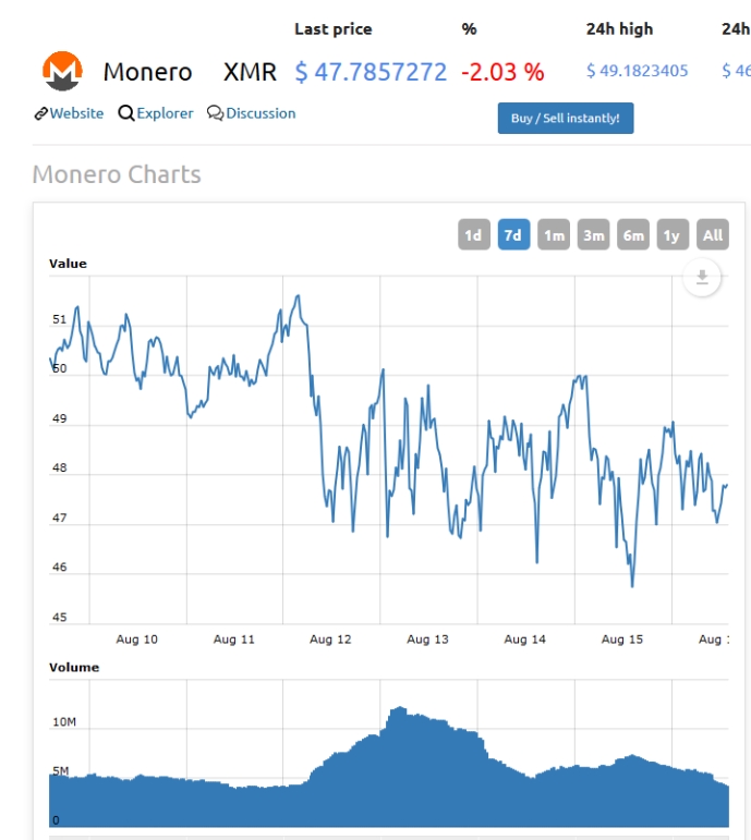 Cenový vývoj meny monero (XMR) v priebehu piatich dní