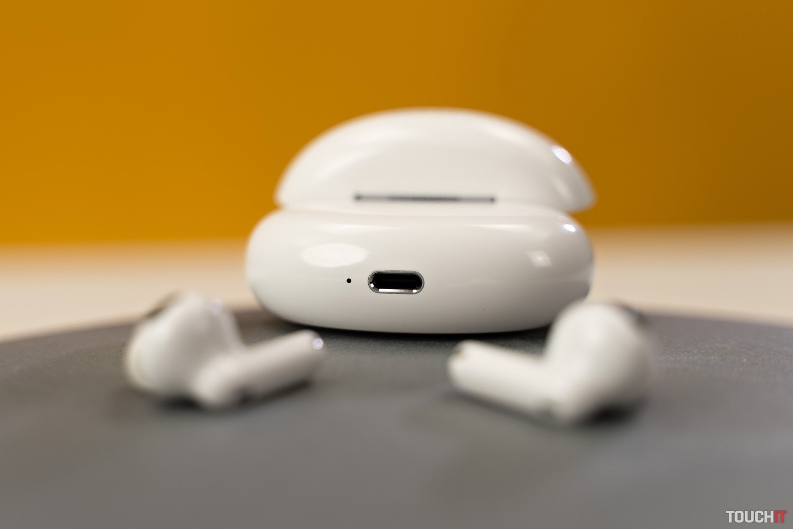 Povrch puzdra je hladký, ale nie veľmi klzký. V spodnej časti sa nachádza USB-C port a LED dióda. Dvierka sa otvárajú do 90-stupňového uhla a v uzavretej polohe držia veľmi dobre, čiže nehrozí, že by slúchadlá počas prenášania vypadli z puzdra. Pánt veľmi dobre drží puzdro otvorené aj pri vyberaní slúchadiel. Pri tejto činnosti je však potrebné získať určitú prax. Následne je vyberanie slúchadiel už veľmi rýchle.