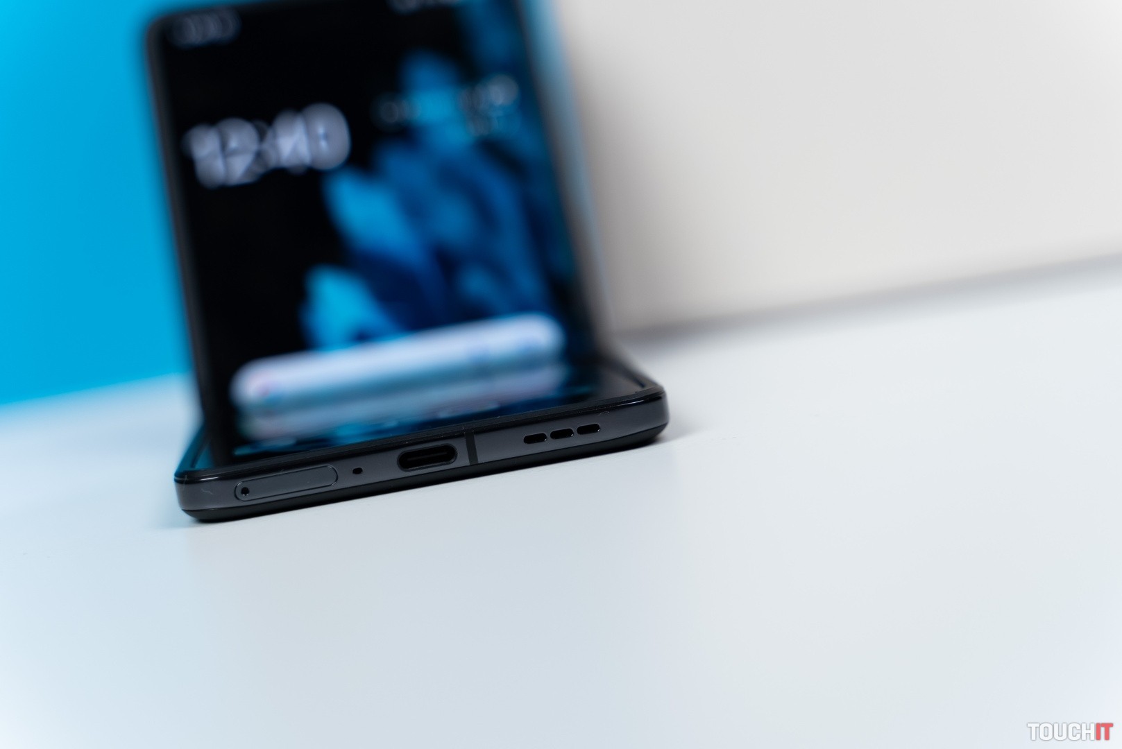 Find N2 Flip teraz váži len 191 gramov a jeho hrúbka je v rozloženom stave v najužšom mieste len 7,45 mm. A to sú vlastne parametre súčasného telefónu, ktorý nie je skladací. Pri zloženom stave telefónu uvidíte na hornej strane pántu textúru v podobe vlny. Hrany telefónu sú zaoblené a telefón dokáže stáť na stole pri položení na kratšiu stranu.