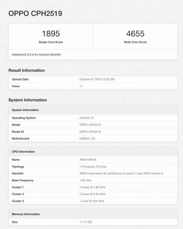 Výsledky prezrádzajú, že zariadenie bude aj na globálnom trhu vybavené čipsetom Dimensity 9200 a 12 GB RAM. Môžeme tak predpokladať, že zvyšok špecifikácií bude taktiež identický s čínskym modelom Find N3 Flip. Zmeny sa neočakávajú ani pri softvéri. Find N3 Flip by tak mal využívať Android 13 a používateľské rozhranie ColorOS 13. Výpis z testu porovnávacej platformy Geekbench odhalil aj výkon globálnej verzie Find N3 Flip. V single-core teste tento telefón získal 1 895 bodov a v multi-core teste 4 655 bodov.