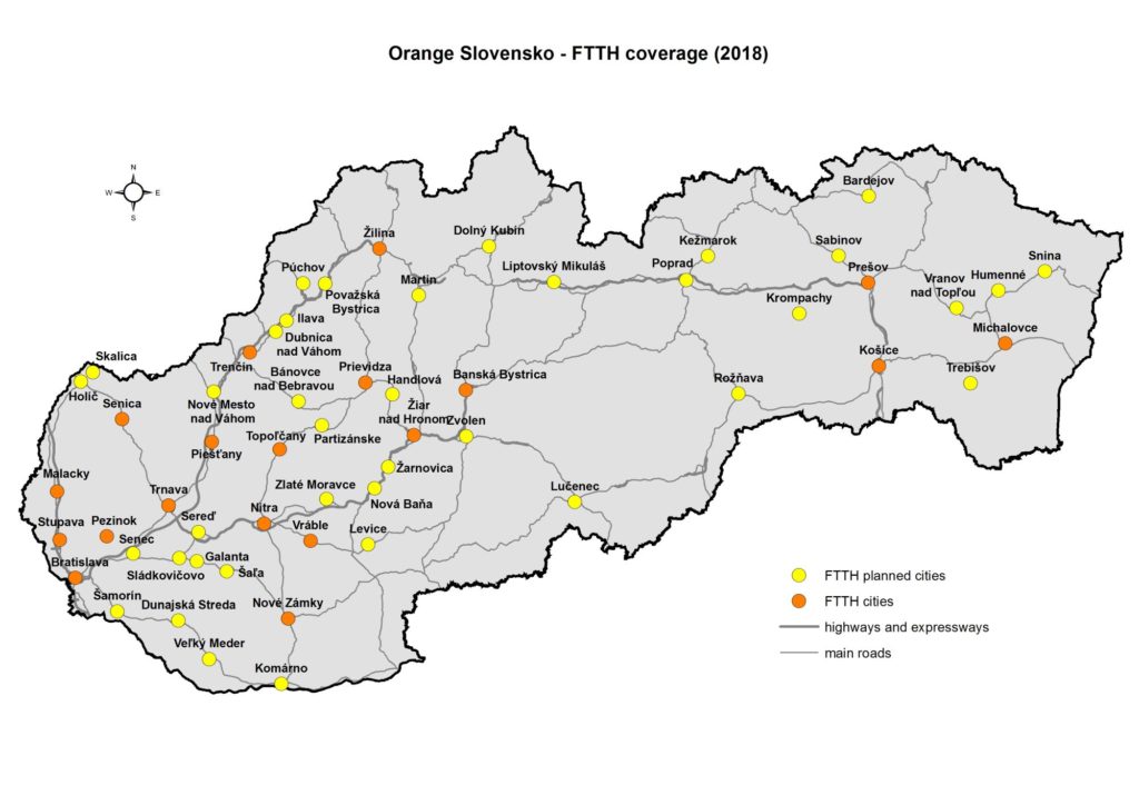 Mapa s lokalitami, ktoré Orange optikou dnes pokrýva (oranžové bodky) a ktoré plánuje pokryť (žlté bodky) do roku 2018Realita vs. plán