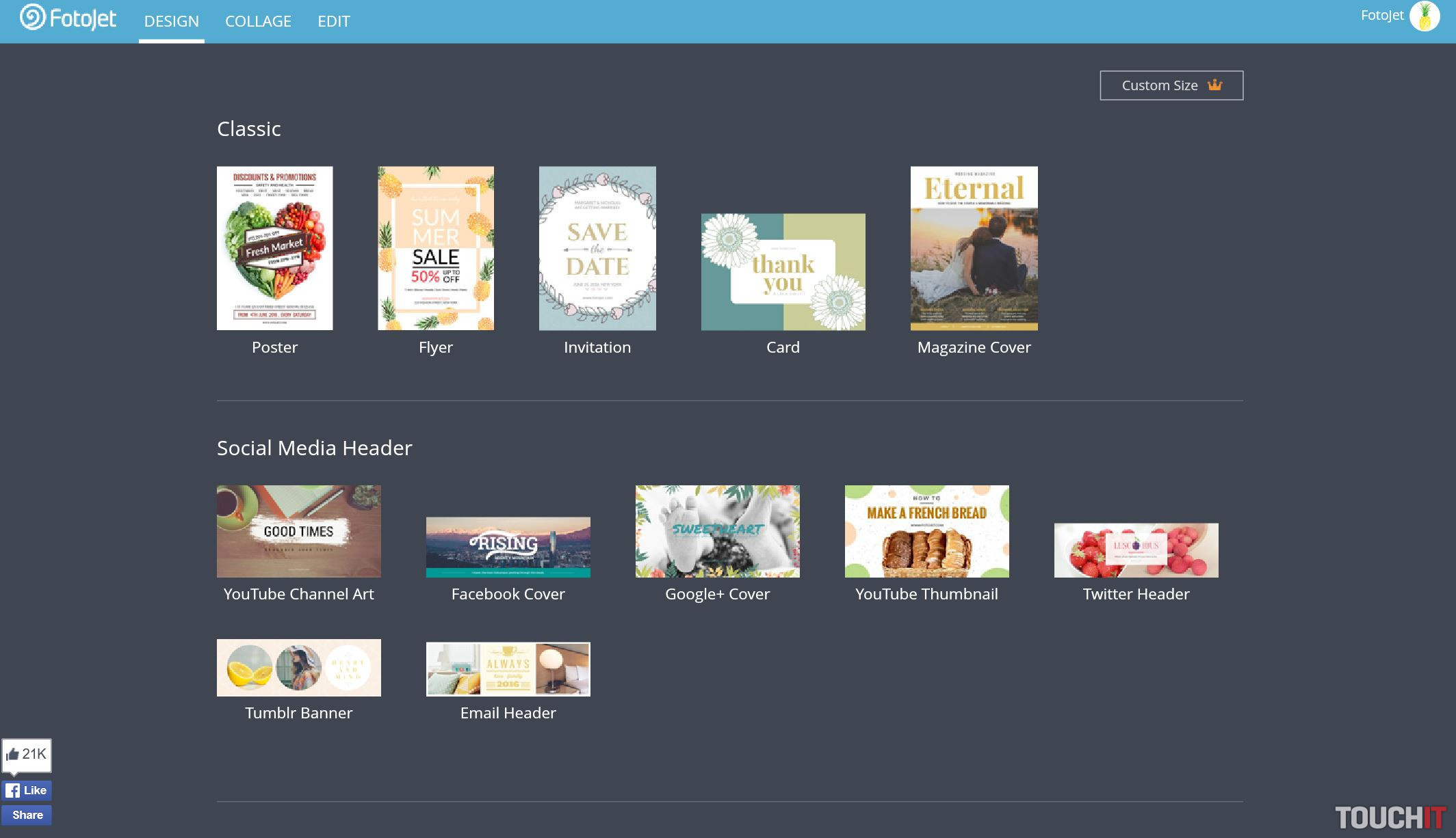 Sekcia Design umožňuje tvoriť reklamné letáky, pozvánky, plagáty, ale aj hlavičkové obrázky na sociálne siete, či štýlové príspevky na Facebook alebo Instagram. Toto sú funkcie, ktoré sme využili aj my. Samotný proces navrhovania dizajnu je jednoduchý. Vyberiete si niektorú zo šablón a upravíte jej fotografiu a text. FotoJet v tomto smere ponúka množstvo obsahu, z hľadiska textu poteší bohatou databázou fontov a pár základnými efektami. V prípade potreby môžete výsledok obohatiť aj o kliparty. Dá sa s tým naozaj vyhrať, len treba byť kreatívny.