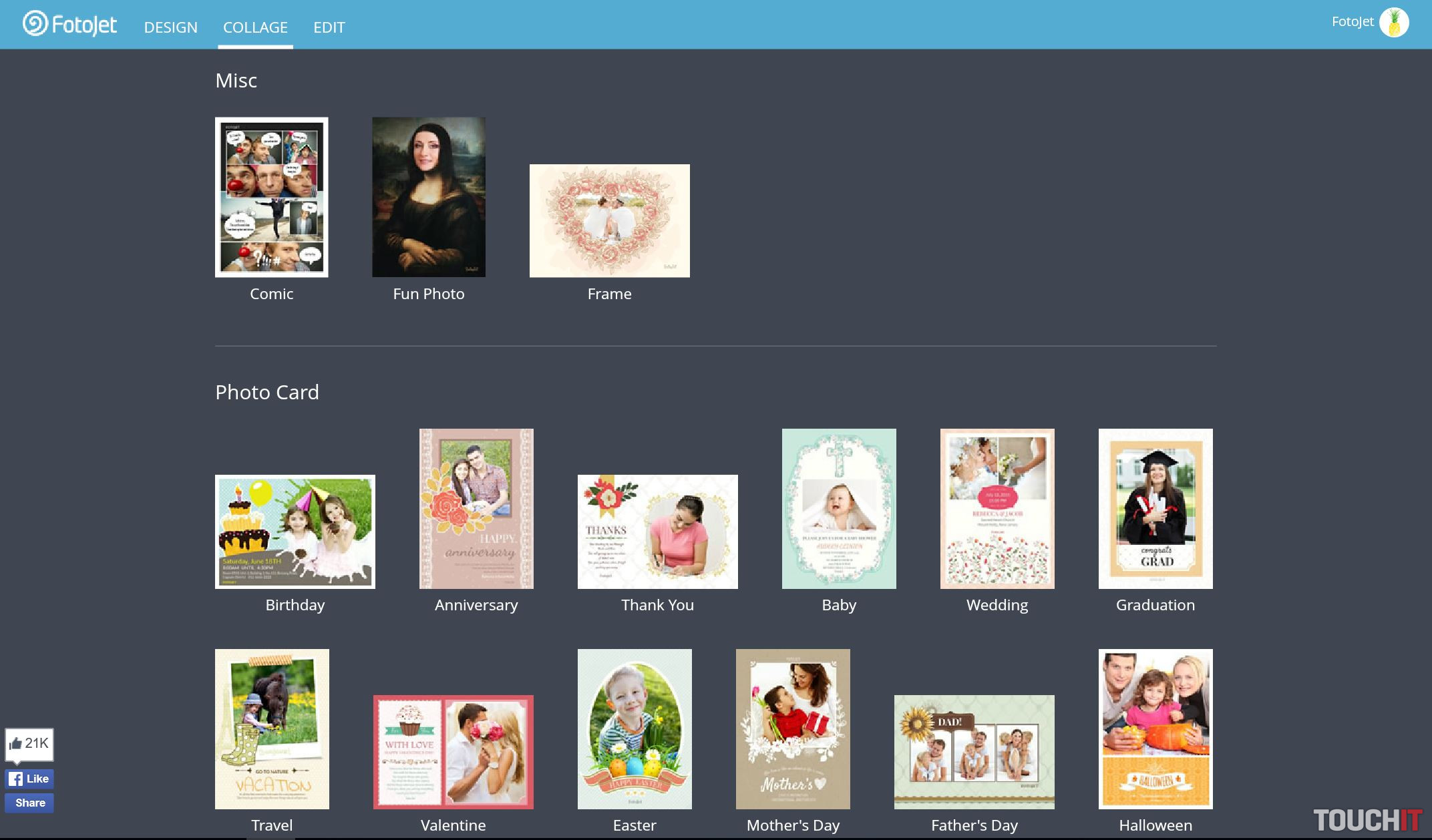 Na službe FotoJet sme počas testovania ocenili kombináciu komplexných nástrojov a intuitívneho ovládania. Služba je rozdelená do 3 sekcií – Design (Dizajn), Collage (Koláž) a Edit (Úprava fotiek).