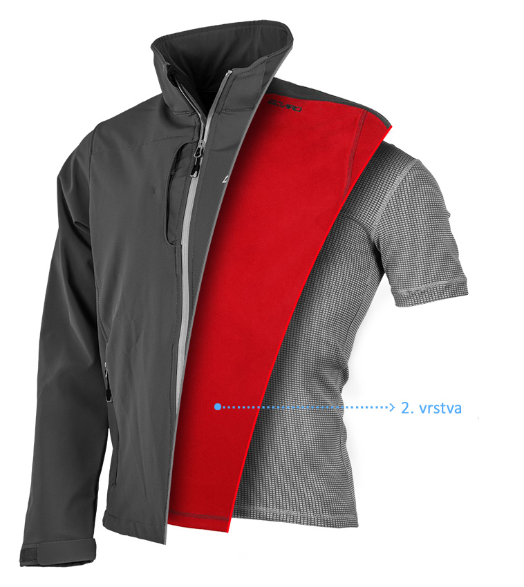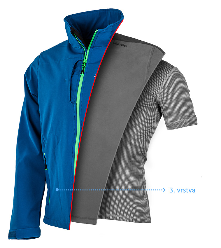 Softshell sa však môže použiť aj ako druhá vrstva. Vyznačuje sa úplnou ochranou pred vetrom a čiastočnou ochranou pred dažďom, ktorá je najčastejšie tvorená vodoodpudivou úpravou vonkajšej strany materiálu napr. DWR, ktorá znesie naozaj veľa. Takisto je však potrebné dbať na pravidelné ošetrovanie a impregnovanie.Tretiu vrstvu odporúčame vyberať v závislosti od klimatických podmienok a určiť, či potrebujete hardshellovú vodoodolnú, vetruodolnú, alebo softshellovú bundu, prípadne zateplenú bundu.Do tretej vrstvy môžeme zaradiť aj nohavice, pre ktoré platia rovnaké pravidlá ako pre bundy. Rovnako rozlišujeme medzi vodeodolnými, vetruodolnými či softshellovými nohavicami. Pre zachovanie komfortu odporúčame nohavice umožňujúce voľný pohyb. Turistické nohavice by mali byť vystužené na kolenách a v sedacej časti a mali by mať zvýšený pás. Zároveň je vhodné, ak na spodnom okraji majú možnosť stiahnutia.