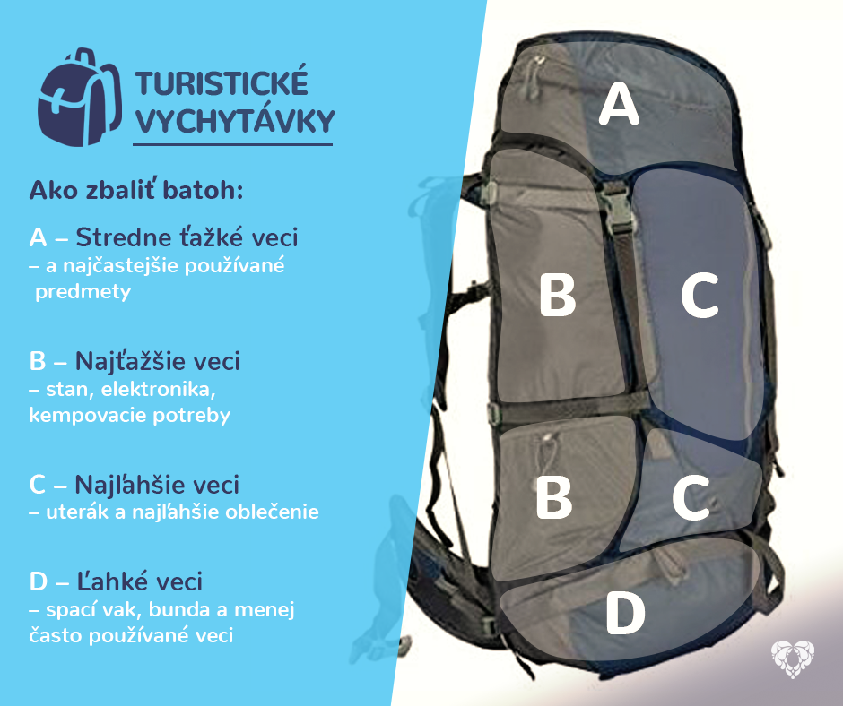 Veľa turistov má vybudovaný svoj vlastný systém balenia. Niektorí si ho vypracovali rokmi praxe, no existuje niekoľko pravidiel, ktorými by sme sa mali riadiť všetci. Nezabúdajte utiahnuť všetky kompresné popruhy na batohu. Obsah sa potom nepohybuje po chrbte a je tak v maximálnej možnej miere umožnený flexibilný pohyb aj v ťažšom teréne. Medzi príručnú výbavu, ktorá by mala byť neustále poruke, patrí napríklad telefón, mapa, doklady, lekárnička, núdzové oblečenie, jedlo, alebo KPZ. V horskom prostredí je veľakrát počasie nepredvídateľné, takže je vhodné baliť tento obsah do viacerých nepremokavých obalov. Rozloženie obsahu batohu si naplánujte aj podľa času používania. Veci, ktoré budete potrebovať až večer, alebo sú menej potrebné, pokojne uložte v batohu nižšie.Seriál Outdoor od hlavy po päty nájdete na tomto odkaze.