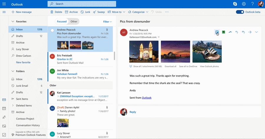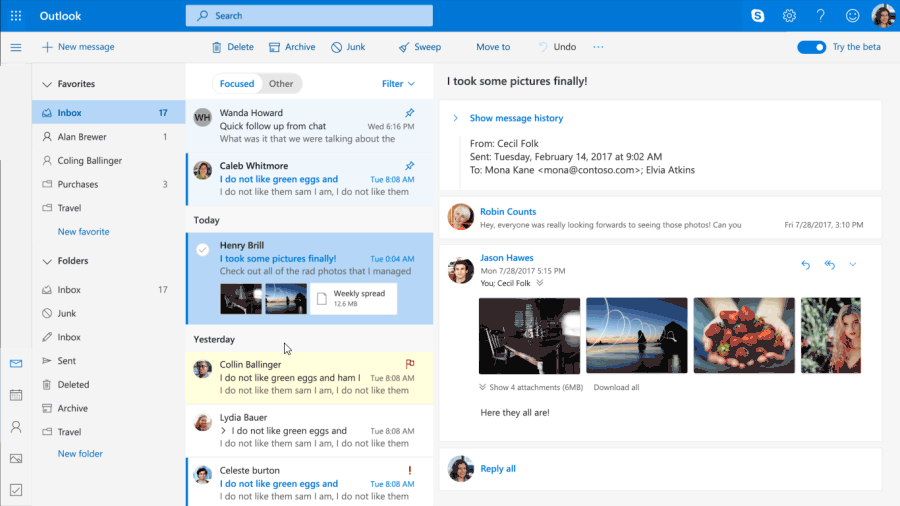 Nový e-mail prináša používateľom množstvo zmien, ktorých cieľom je lepšia personalizácia, vyššia rýchlosť rozhrania či inteligentnejšia práca s doručenou poštou. Aktualizovala sa však aj integrácia služby Skype. Tá teraz umožňuje výrazne jednoduchšiu a rýchlejšiu komunikáciu počas toho, ako sa používateľ nachádza vo svojej e-mailovej schránke. Kontakty sú neustále k dispozícii a tak je zavolanie kamarátovi záležitosťou sekundy. Prichádza tiež prepracovaná kategorizácia e-mailov. Používatelia tak môžu ku každému e-mailu priradiť jednu, ale aj desať kategórií, ktoré si vedia pomenovať podľa seba a priradiť im aj špecifickú farbu. Následne filtrovanie e-mailov je veľmi jednoduché a môže prebiehať napríklad cez vyhľadávanie, kde stačí jednoducho zadať názov kategórie. Priečinok doručenej pošty je najnovšie obohatený aj o prepínač medzi dôležitou poštou a tou zvyšnou, s ktorým sa veľmi pohodlne pracuje. Azda najlepšou správou pre milovníkov Outlook.com sú veľmi prepracované doplnky, vďaka ktorým sa dá služba prepojiť s aplikáciami tretích strán. Ich inštalácia a následná práca s nimi je veľmi jednoduchá. Aktuálne je k dispozícii napríklad doplnok pre PayPal, Trello, Evernote či GIPHY.Prepracované funkcie kalendára