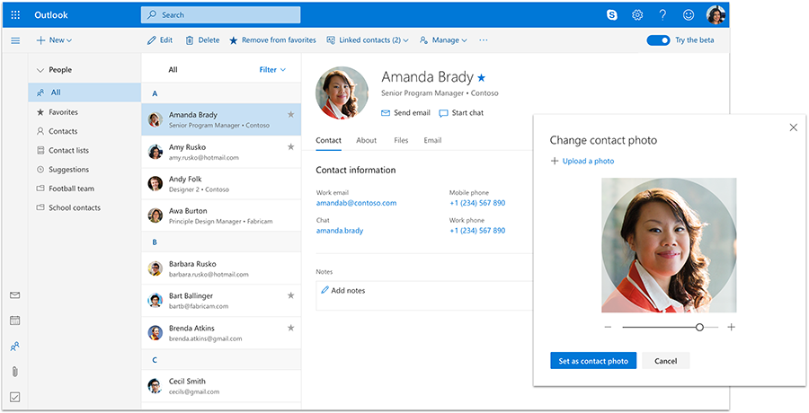 V novej verzii kontaktov je teraz výrazne jednoduchšie vytvárať, upravovať či vymazávať kontakty. Aktualizoval sa tiež vzhľad jednotlivých kariet v ktorých sa nachádzajú profily a ďalšie informácie o kontaktoch. Vo veľkej karte kontaktu je taktiež najnovšie umožnený prístup k e-mailom a súborom od predmetného kontaktu. Okrem pridávania narodenín či osobných poznámok umožňuje najnovšie Outlook.com pridávať aj fotky ku kontaktom. Veľkou výhodou je aj prítomnosť jednoduchého nástroja na výrez fotky. Kontakty sa dočkali aj lepšej integrácie s ostatnými časťami služby. Z prostredia kontaktov je tak veľmi jednoduché začať písať e-mail prípadne zavolať kamarátovi cez Skype. Zdroj: Blog OfficePodobné články