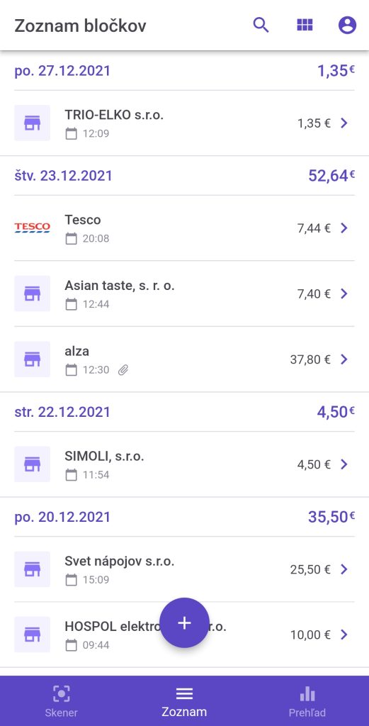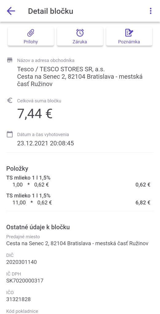 Pri skenovaní sa načítava QR kód z účet a do textovej podoby prenesú najdôležitejšie údaje – suma, označenie predajcu vrátane jeho IČO, DIČ, adresy predajného miesta, dátumu nákupu a označenie jednotlivých položiek tovaru. Tiež tu nájdete ID bločku, kód pokladnice a podobné detailné údaje, pre firmy je podstatný aj rozpis DPH. V grafickej podobe sa tu uschová aj QR kód bločku. Ten sa dá overiť pomocou štátnej aplikácie OverDoklad priamo na Finančnej správe SR.