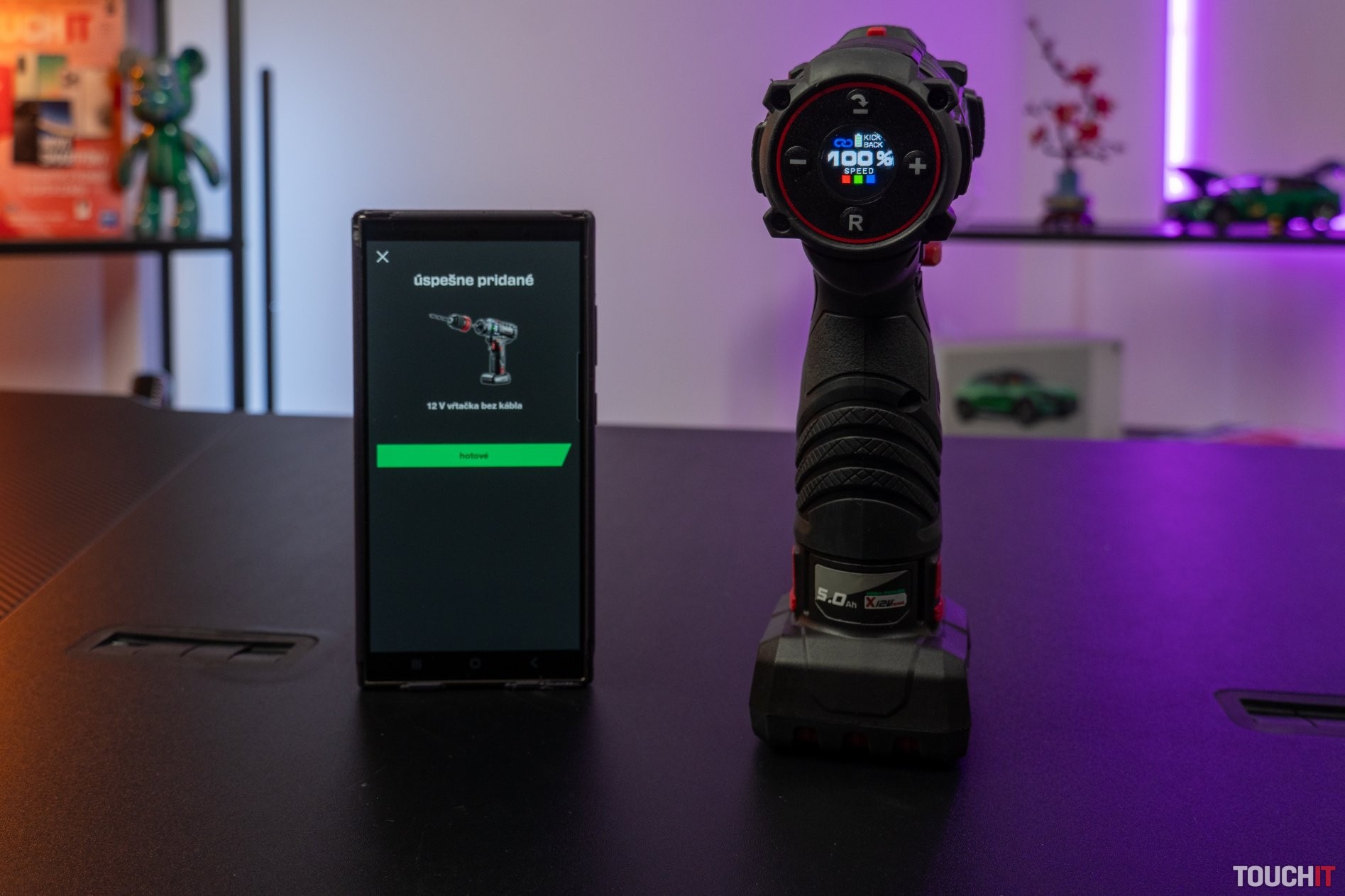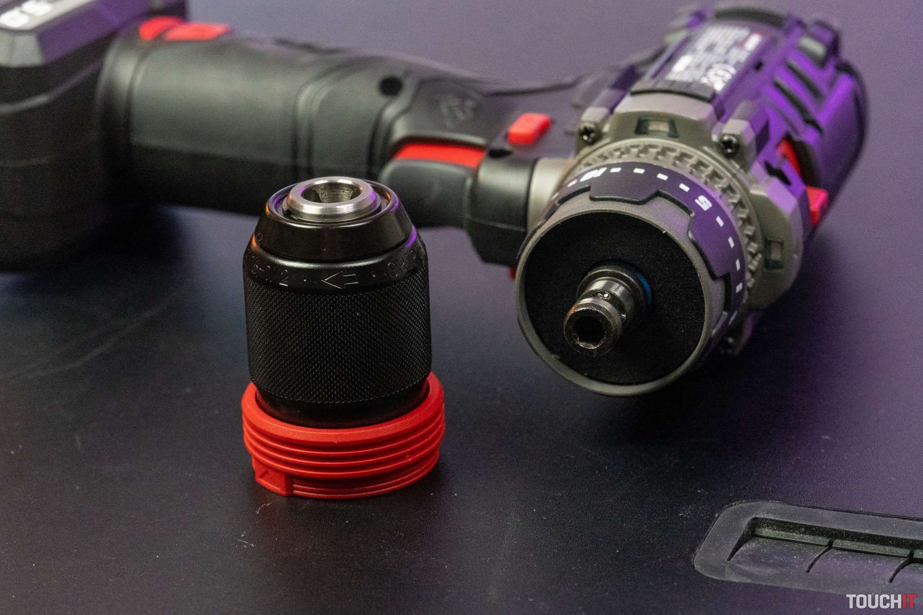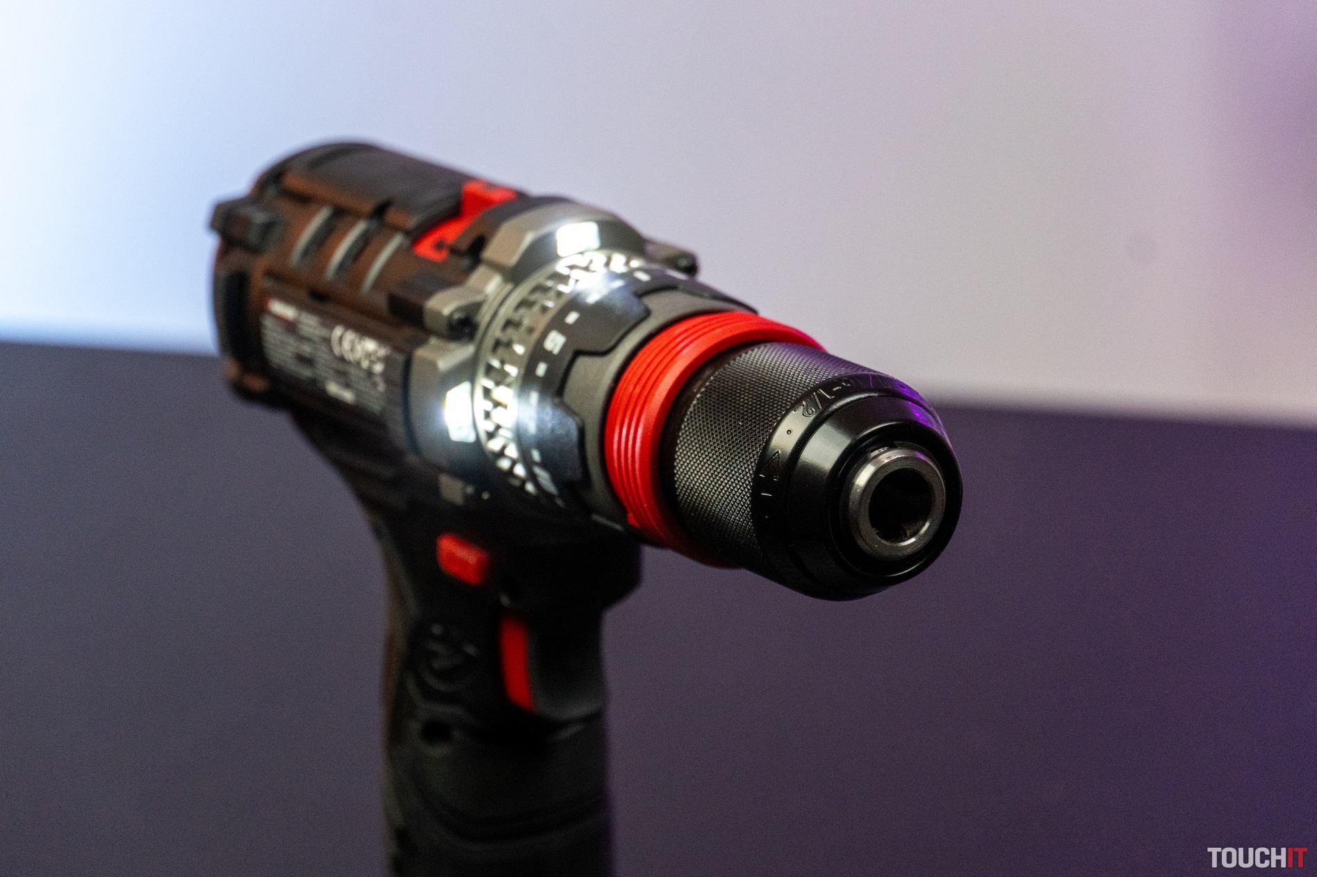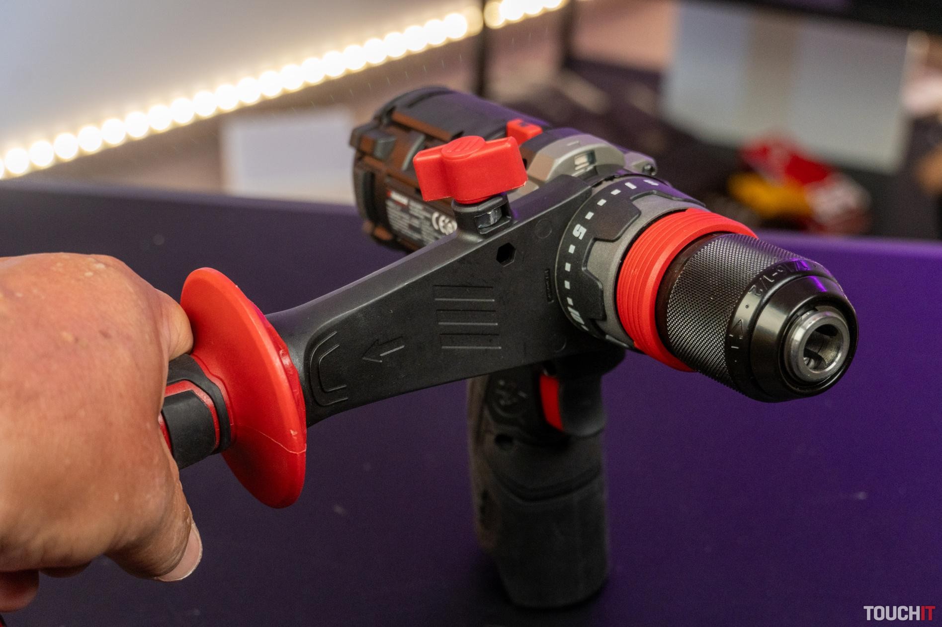 Pri práci môžete využiť aj LED svetlo, jeho farbu je možné nastaviť v aplikácii (viď ďalej). Na vŕtačke nájdete dva praktické magnetické držiaky bitov. Rozsah upnutia rýchloupínacieho skľučovadla je od 1,5 do 13 mm.