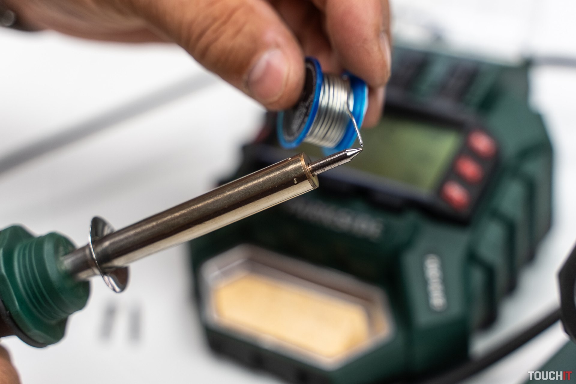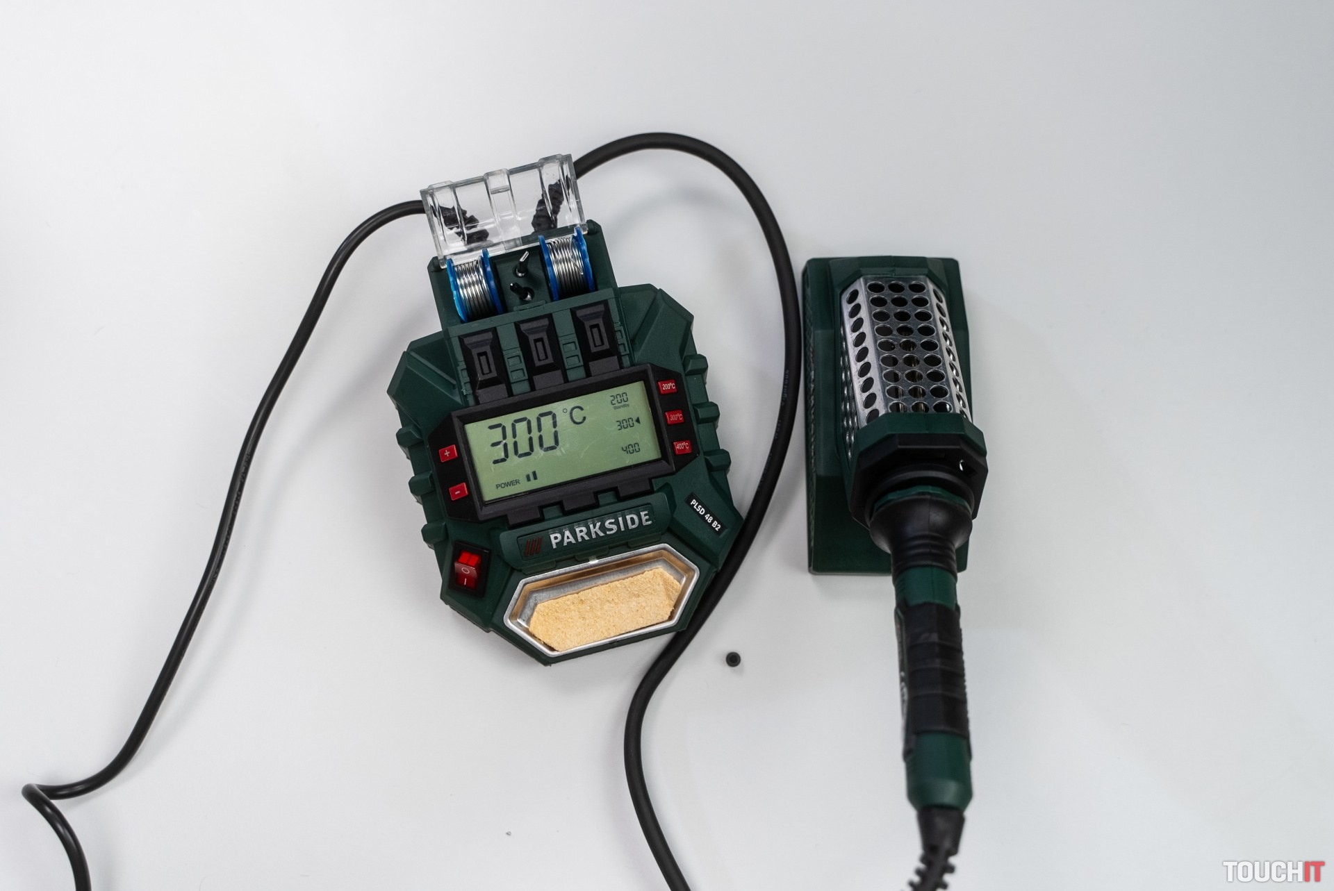 V dodávke dostávate jednak samotnú spájkovačku aj spolu s riadiacim modulom a displejom, ďalej odkladaciu stanicu pre horúcu spájkovačku s protišmykovým povrchom a príslušenstvo. To tvoria tri výmenné hroty, miska s čistiacou špongiou a dve cievky so spájkovacím cínom s odlišným priemerom 1,5 mm a 1,0 mm. Túto spájkovačku použijete v elektronike, modelárstve a celkovo v domácnosti. Na riadiacej stanici nájdete tri tlačidlá rýchlej voľby 200/300/400 °C.