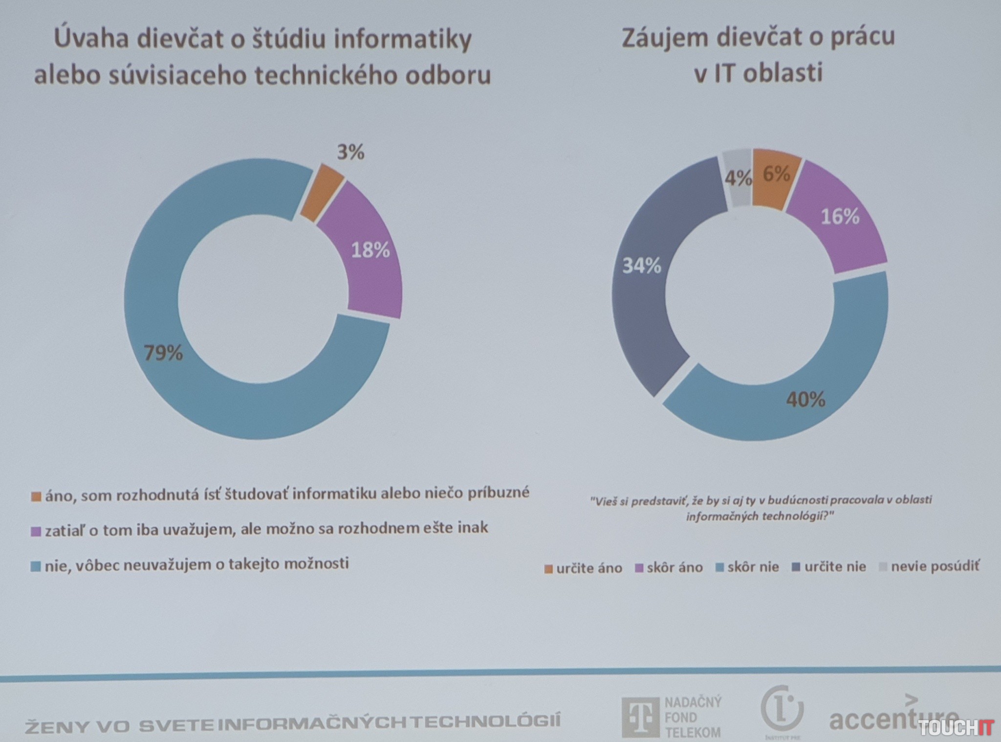 Podľa najnovšieho reprezentatívneho prieskumu INŠTITÚTU PRE VEREJNÉ OTÁZKY (IVO) o štúdiu informatiky alebo podobného odboru uvažuje celkovo 21% dievčat vo veku 14 – 17 rokov. Ďalších 22% dievčat si vie predstaviť svoju budúcu kariéru v oblasti informačných technológií, napríklad ako programátorky, analytičky, vývojárky, administrátorky sietí, webové dizajnérky, grafičky, multimediálne špecialistky, či špecialistky na internetovú reklamu a marketing.