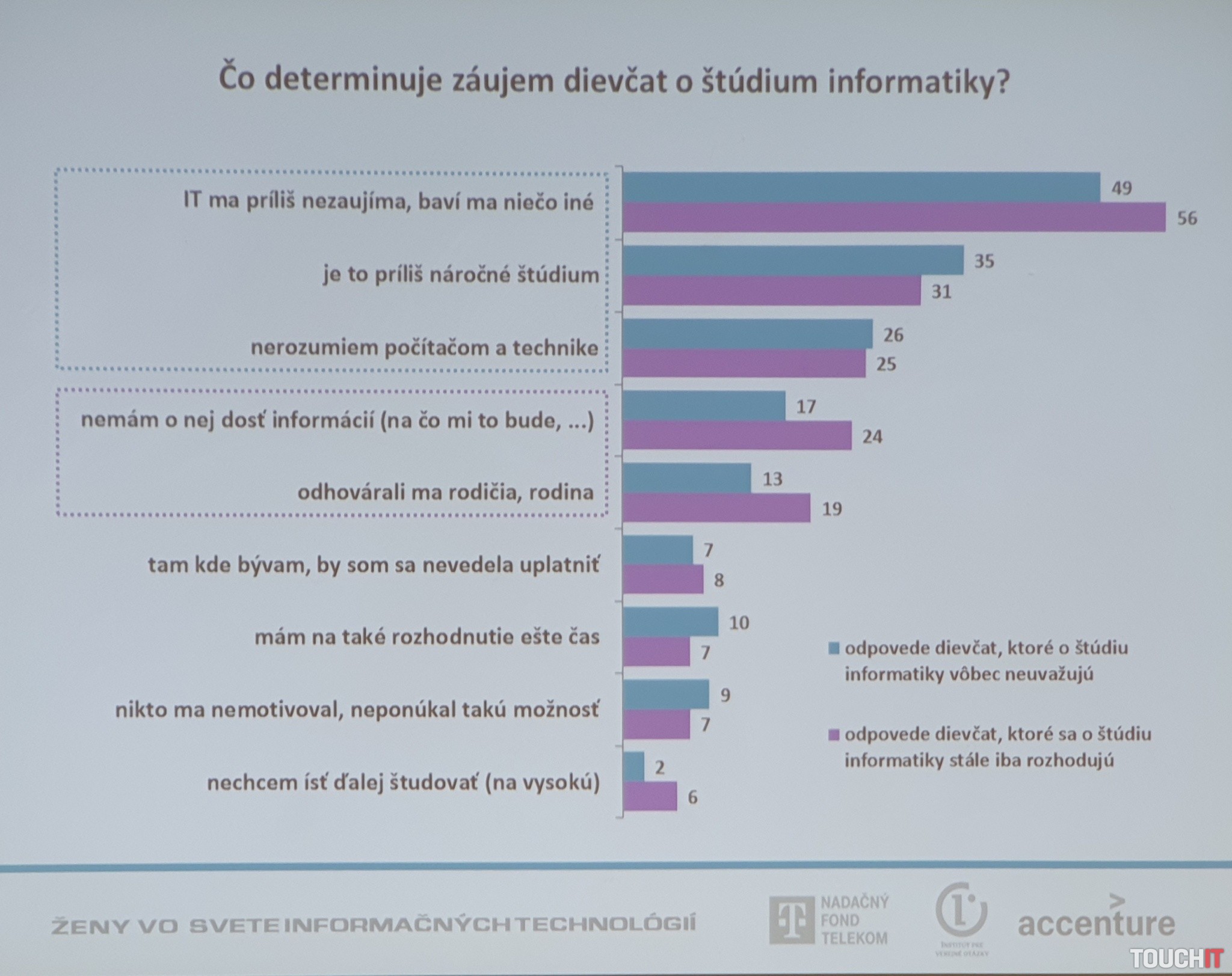 Úvahy o štúdiu informatiky pritom determinujú rôzne okolnosti. Medzi dievčatami, ktoré odmietajú študovať (79%) je dôvodom najmä nezáujem, resp. orientácia na niečo iné ako informatiku (49%), prílišná náročnosť štúdia (35%) a neschopnosť porozumieť počítačom a technike (26%). Pomerne odlišná je váha argumentov u dievčat, ktoré sa stále rozhodujú. Aj medzi nimi rezonuje „strašiak“ náročnosti štúdia (31%) alebo neschopnosť porozumieť počítačom a technike (25%). No nadpriemerne často sa objavujú aj dôvody ako je nedostatok informácií o kariére informatičky (24%) a odhováranie rodičmi, napr. keď ich predstavy o budúcom povolaní dcéry sú iné (19%) a pod.