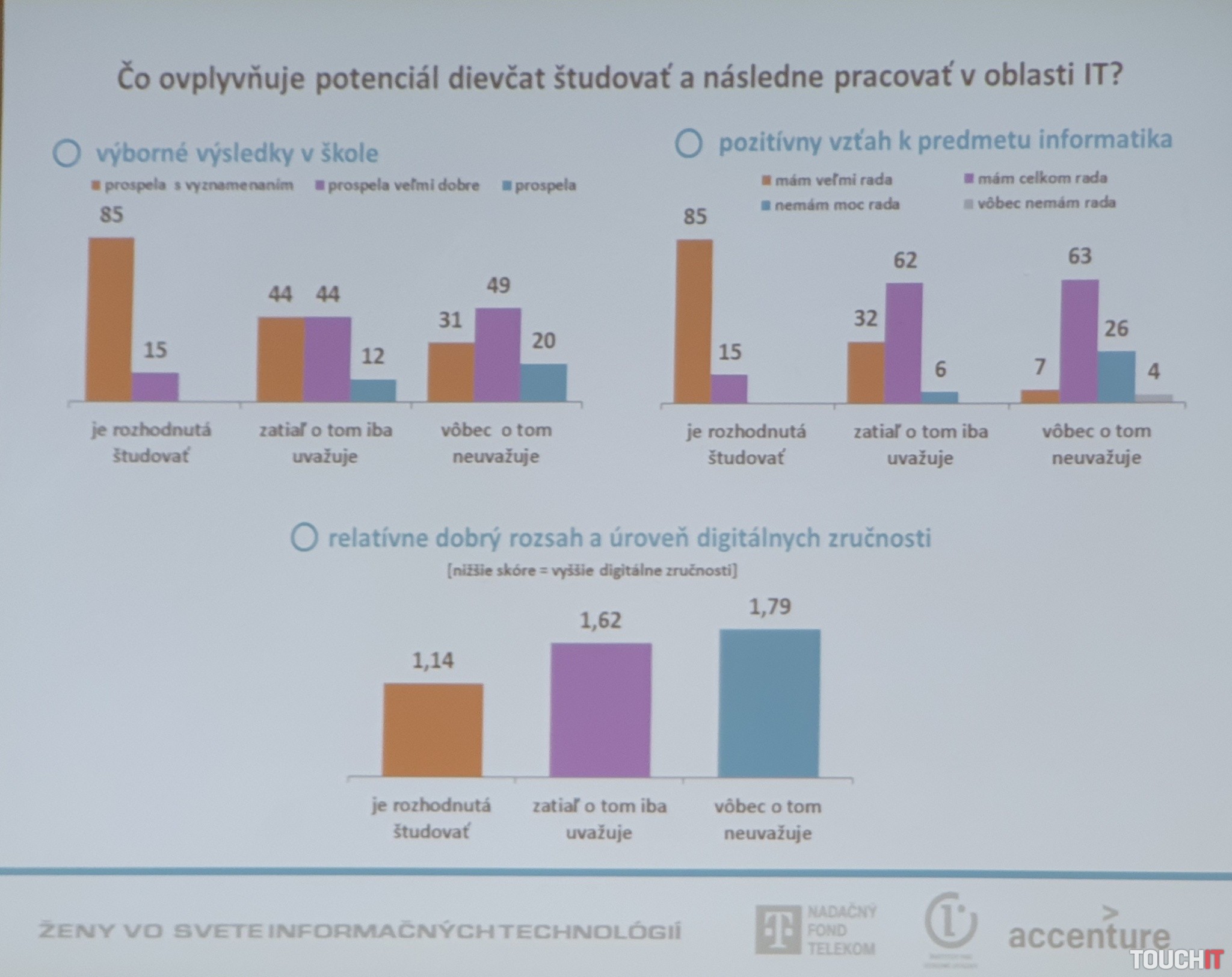 Ďalšie zaujímavé zistenia o postojoch dievčat a žien k IT sa dozviete zo štúdie Ženy vo svete informačných technológií, ktorú podporil Nadačný fond Telekom a spoločnosť Accenture. Štúdia je voľne dostupná na www.ivo.sk.