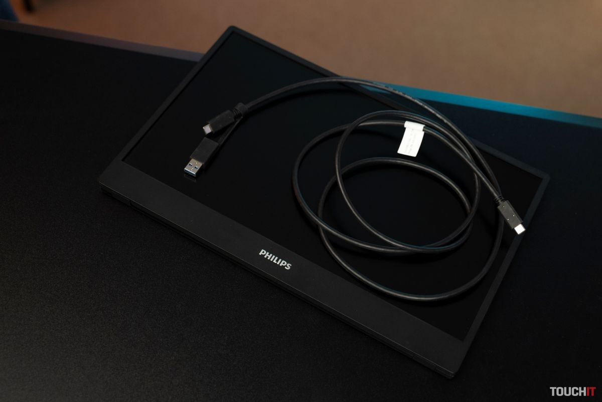 Súčasťou základného balenia je USB-C kábel s USB-A adaptérom a ochranný obal na prenášanie monitora. Philips 16B1P3302D obsahuje aj 3,5 mm jack a tlačidlá na reguláciu hlasitosti.