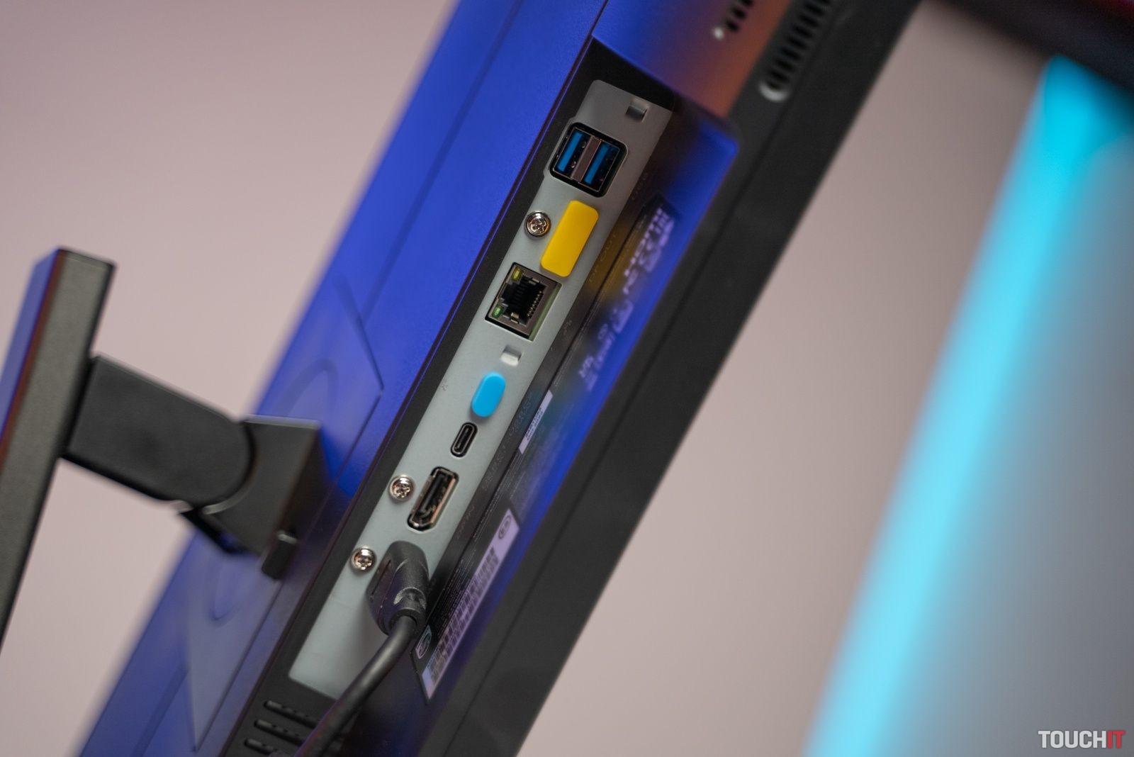 Ak raz niečo nastavíte, tak to jednoducho drží na svojom mieste. Stojan má v spodnej časti aj výrez na káble. Ide o veľmi efektívne riešenie ich organizácie, ktoré je nielen praktické, ale aj dizajnovo veľmi pekné. Výbava portov je ukážková, avšak taká bohatá, že odporúčam pozrieť tabuľku na konci článku, kde sú všetky uvedené. V každom prípade nechýba DisplayPort 1.4, HDMI 1.4, USB-C, pripojenie RJ-45 (LAN), slúchadlový výstup / AUX, USB 3.2 Gen 2 (USB 3.1), 4 × USB. V balení sa nachádzajú aj potrebné káble – HDMI, DisplayPort a USB-C.
