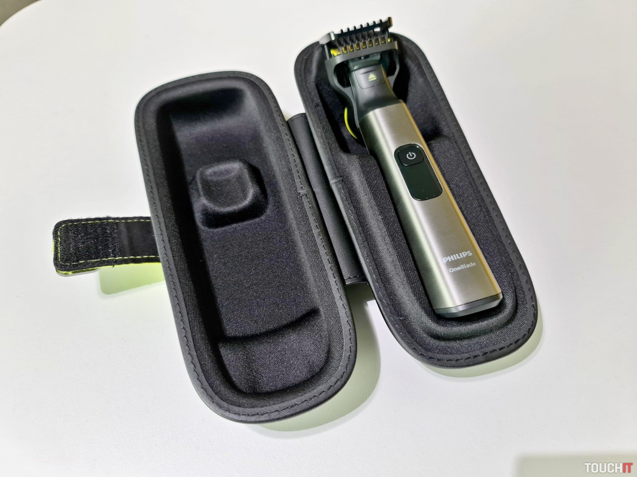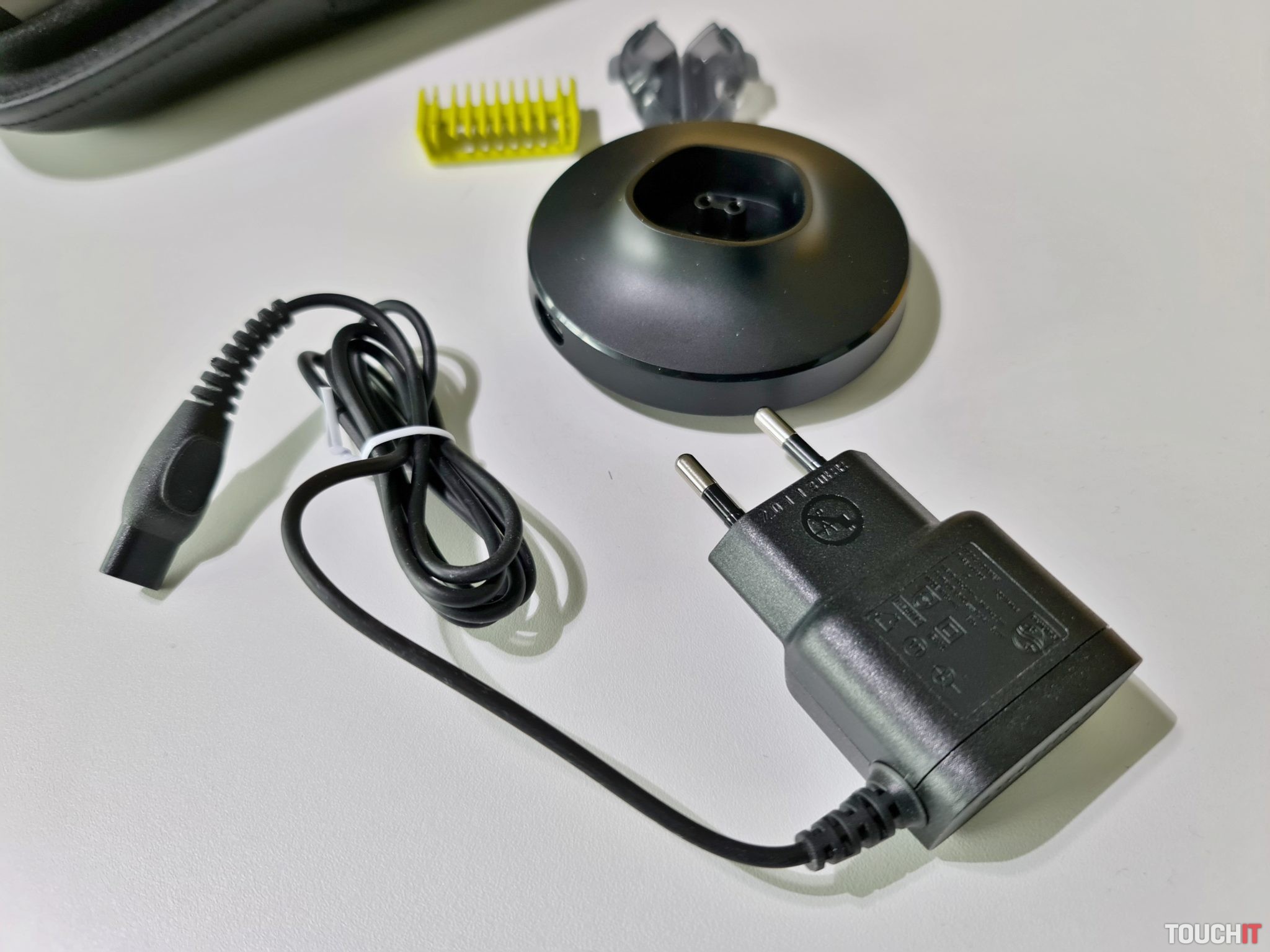 Obsah dodávky potom dotvára pevné puzdro, do ktorého sa zmestí Philips OneBlade Pro aj s nastaviteľným nástavcom. Napájací zdroj sem nevojde. V dodávke je ešte podstavec, do ktorého môžete položiť zariadenie spodnou stranou a tento sa dá pripojiť na dodávaný adaptér na 230 V. Vytvára to ucelený systém na holenie, ktorý sa dá umiestniť napr. v kúpeľni.