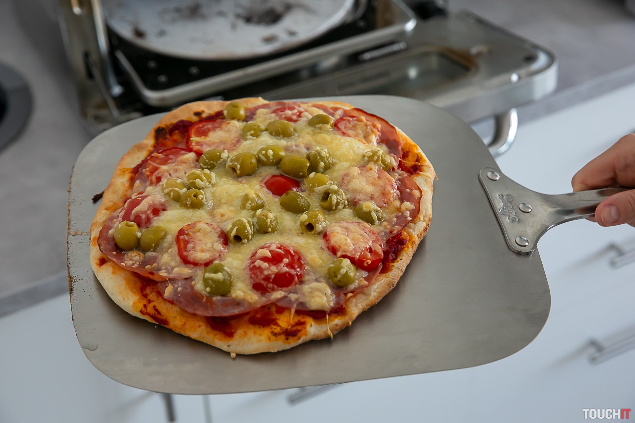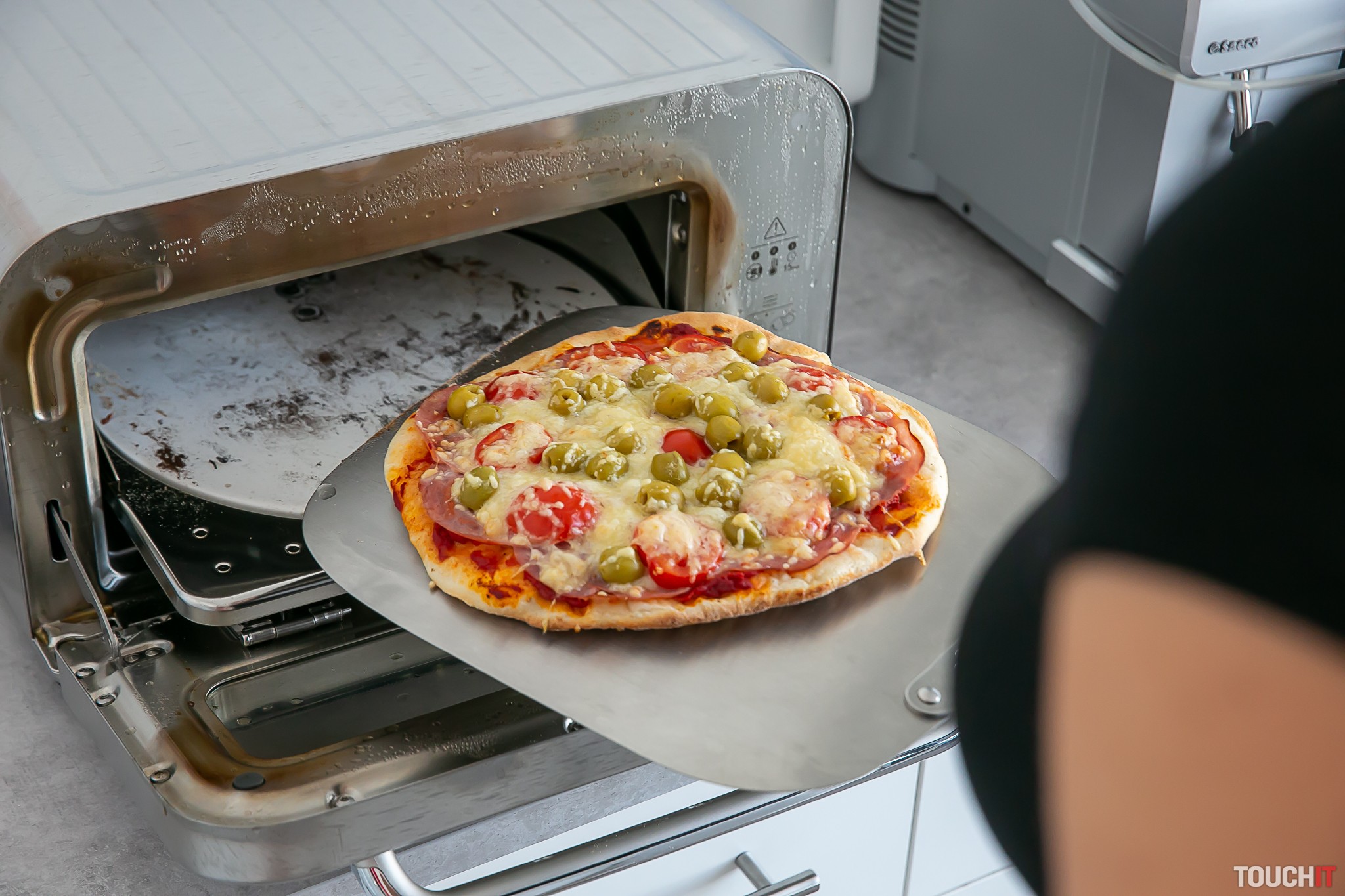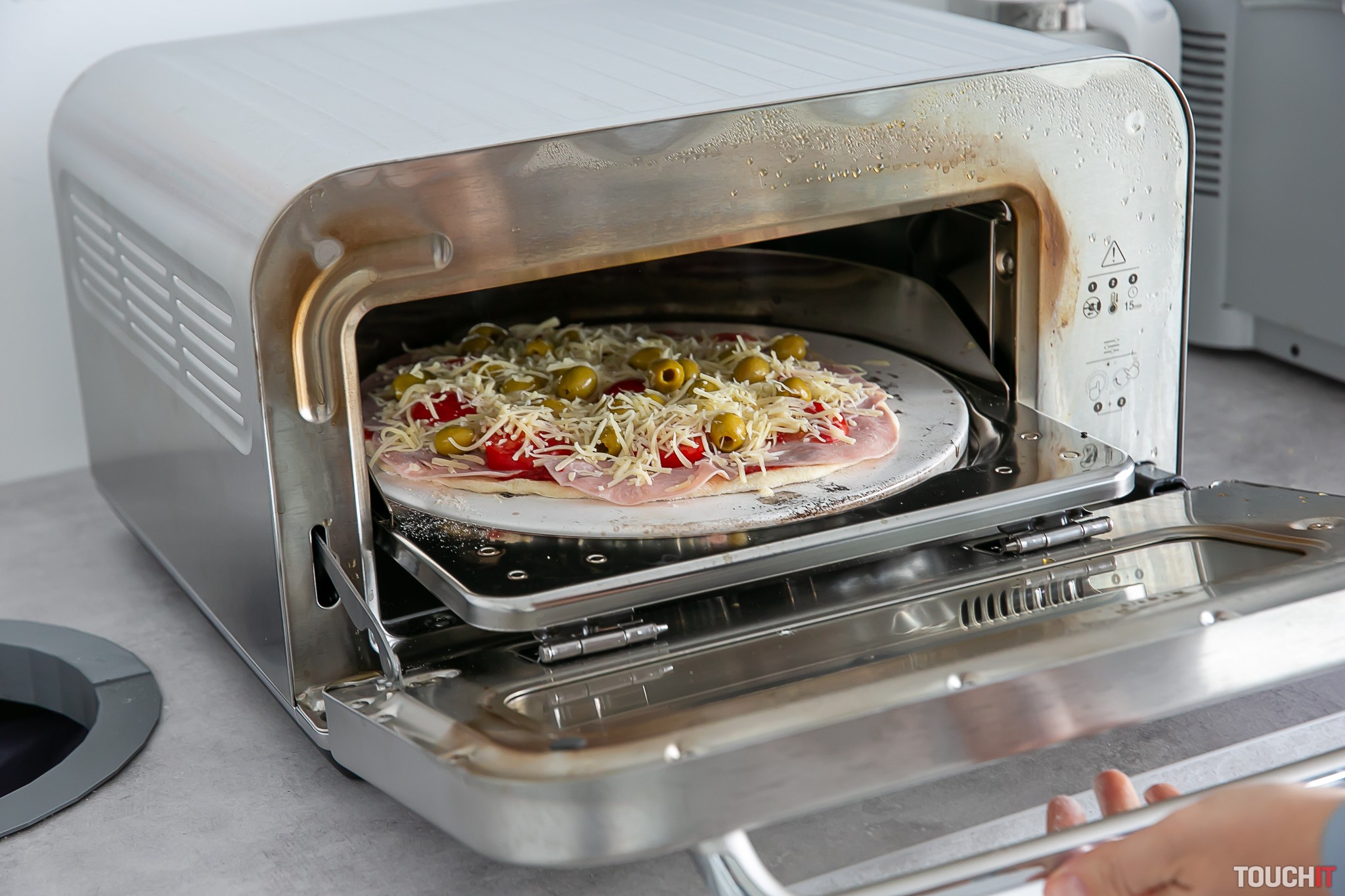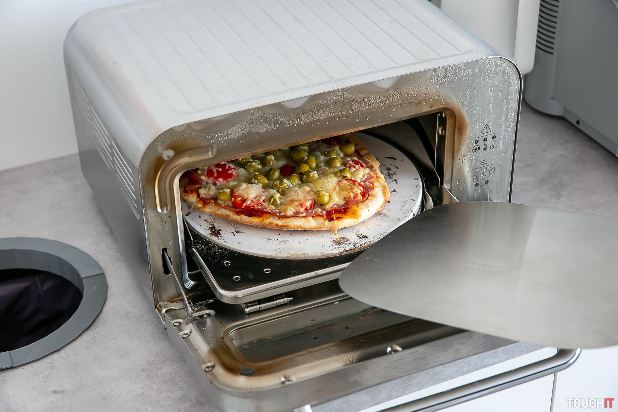 Túto pizzu sme v redakcii testovali niekoľko dní. V reštaurácii, kam chodievame na obed, sa pečie aj pizza a tak sme tu zakúpili už vopred pripravené cesto na pizzu. To výrazne skracuje celú prípravu pizze, lebo pec zapnete, necháte asi 20 minút nahrievať. Ukončenie nahrievania pec oznámi akusticky. Medzitým cesto vystriete do podoby pizze, naukladáte zvolené ingrediencie, posypete syrom a umiestnite na dodávanú lopatku. Následne vložíte pripravenú pizzu do pece, zatlačíte zvolený program a opäť čakáte, kedy sa ozve pípnutie signalizujúce skončenie pečenia. Neapolská pizza bola hotová za 3 minúty, mrazená pizza sa pripravovala 12 minút. Tenká pizza bola hotová za 7 minút. Ak chcete použiť manuálny program, potom je v dodávke zariadenia aj magneticky pridržiavaná fólia, ktorá zmení označenie programov na údaje o teplote v stupňoch Celzia a dobu pečenia v minútach. Tak sa môžete presne rozhodnúť podľa seba čo bude koľko trvať.