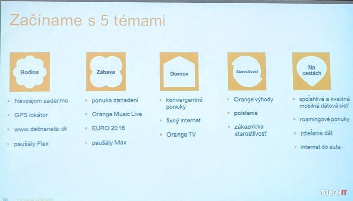Doterajším štandardom v telekomunikáciách bolo „telefonovanie“, „internet“, „multimediálne služby“ či „služby pre biznis“. Orange po novom komunikuje služby pre konkrétne potreby zákazníkov v jednej z 10 kľúčových skupín potrieb, ktoré identifikoval medzinárodný prieskum skupiny Orange: Rodina, Domov, Zábava, Pohoda, Práca, Peniaze, Technológie, Starostlivosť, Ponuka a Na cestách.
