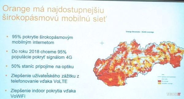 Pavol Lančarič, generálny riaditeľ spoločnosti Orange, hovoril na tlačovej konferencii aj o konkrétnych plánoch operátora na najbližšie 4 roky. Orange chce mať do konca tohto roka 80% pokrytie populácie LTE sieťou. Do roka 2018 to má byť 95% populácie.