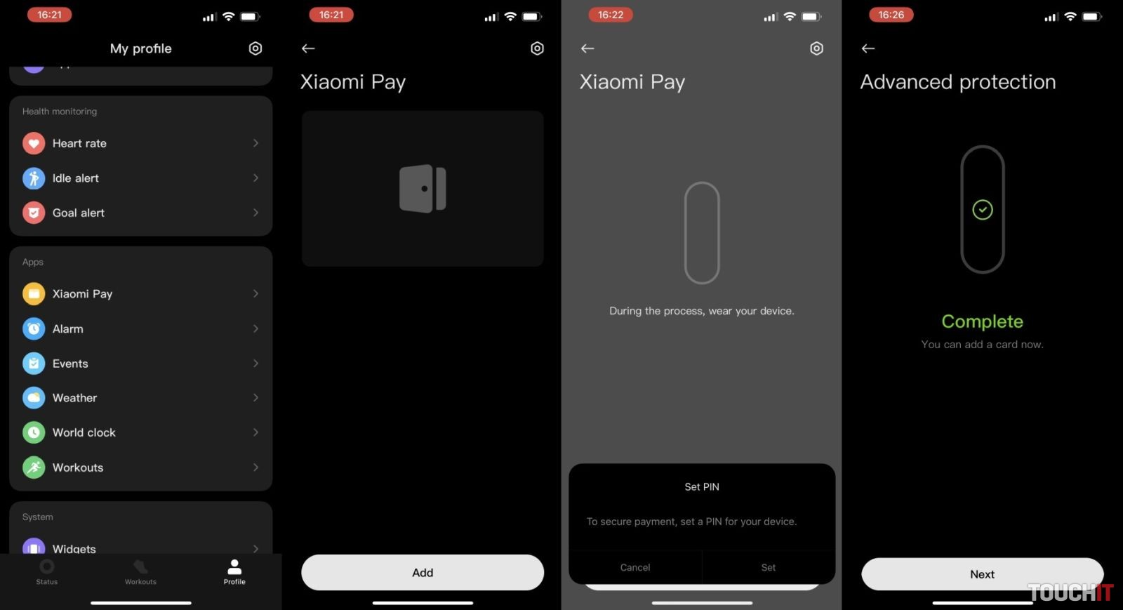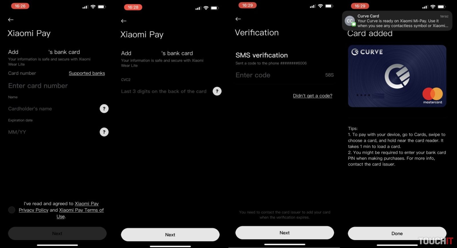 - v rámci procesu nastavenia Xiaomi Pay je potrebné vytvoriť 6-ciferný PIN kód náramku alebo hodiniek, zadať informácie o platobnej karte a proces pridania karty potvrdiť overovacím kódom, ktorý dostanete vo forme SMS správy