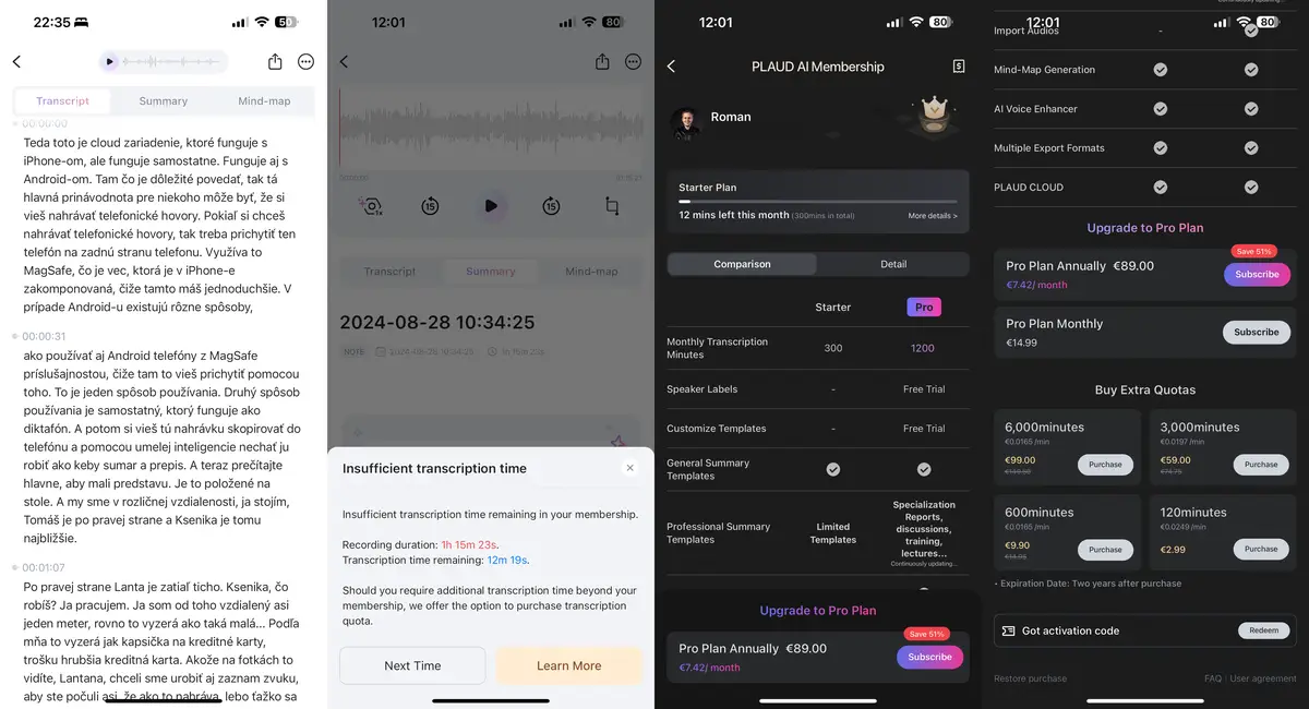 Počas testovania som využíval bezplatné členstvo, nakoľko mi stačilo na moje potreby. Jeho súčasťou je po novom aj automatické označenie jednotlivých rečníkov v rámci nahrávky. Predpokladám však, že pre mnohých používateľov, pre ktorých by mohol byť PLAUD NOTE atraktívny, bude 300 minút málo.