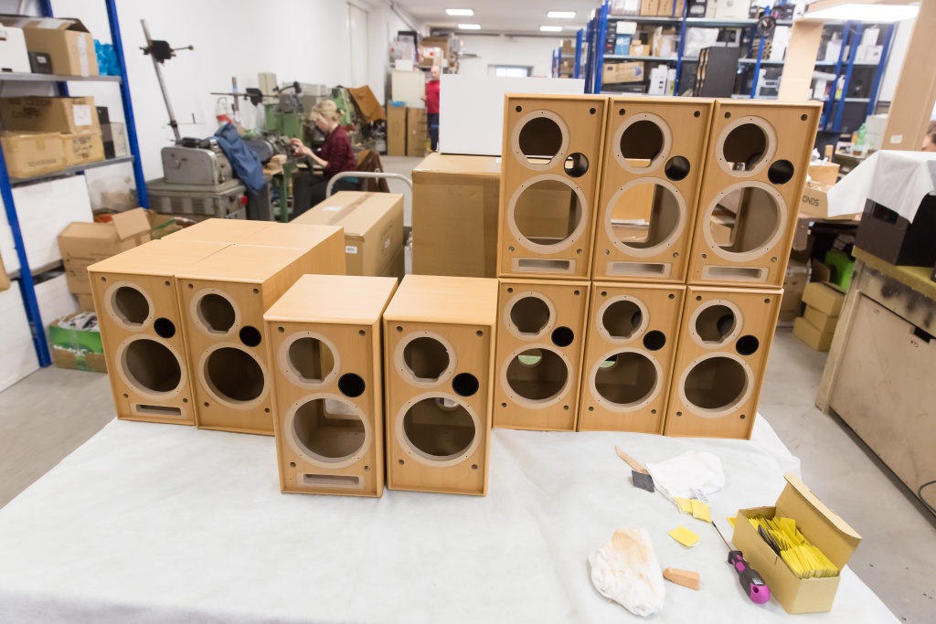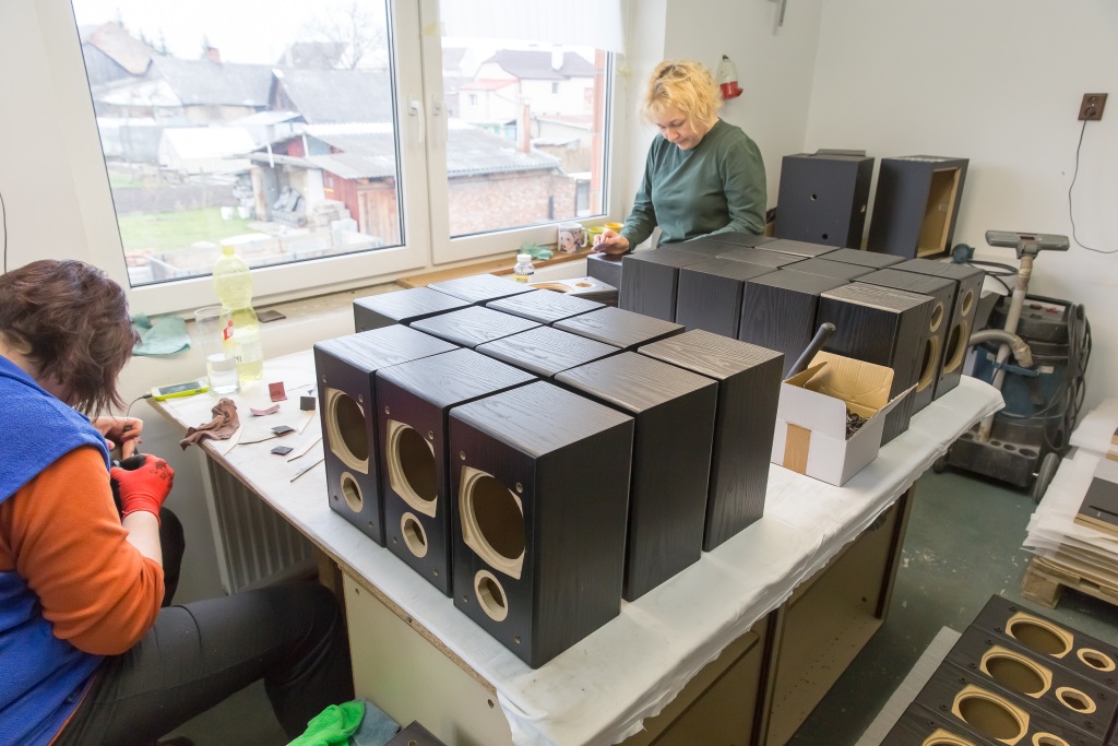 Ako sme videli, je to poctivá a kusová remeselná výroba. Všetky rohy korpusu reproduktora sú zaliate lepidlom tak, aby tu nič nefúkalo. Na vyvŕtanie otvorov sa používajú špeciálne stroje, ktoré to robia s milimetrovou presnosťou. Povrch reprobedne je potiahnutý drevenou fóliou a ženské ruky zarovnajú každú nerovnosť.
