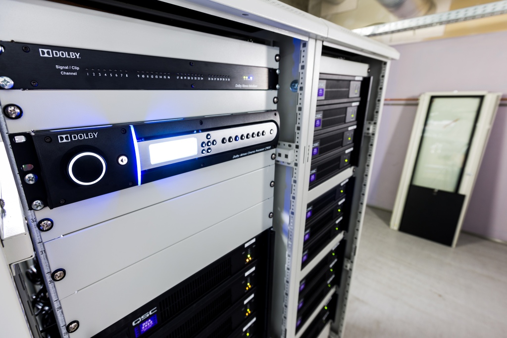 Okrem obrazu je súčasťou SUPERSCREEN aj kvalitný zvuk. O ten sa stará súprava 32 + 5 reproduktorov pracujúcich v priestorovom formáte Dolby Atmos. Za plátnom sme našli ďalších 5 subwooferov.