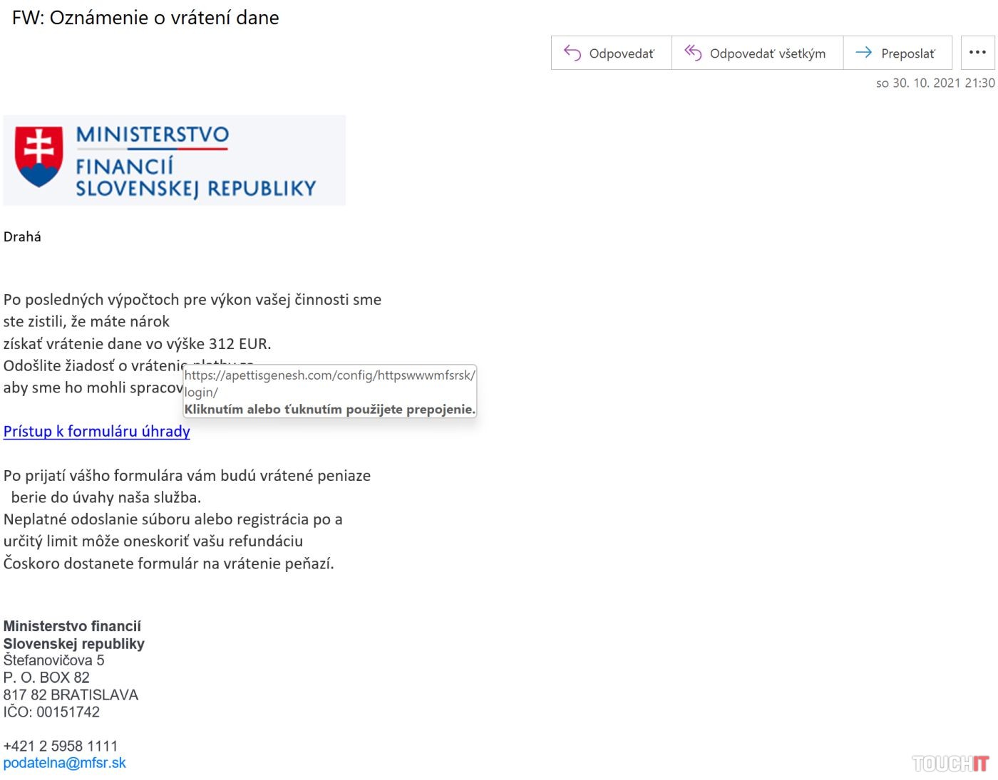 Podvodné emaily majú rôznych „odosielateľov„. Útočníci sa niekedy vydávajú za poštu, inokedy za banku či Facebook a najnovšie to skúšajú pod hlavičkou Ministerstva financií Slovenskej republiky. Na tento podvod ste nás upozornili aj vy a do redakcie ste nám preposlali príklad podvodného emailu, ktorý vraj posiela Ministerstvo financií SR.