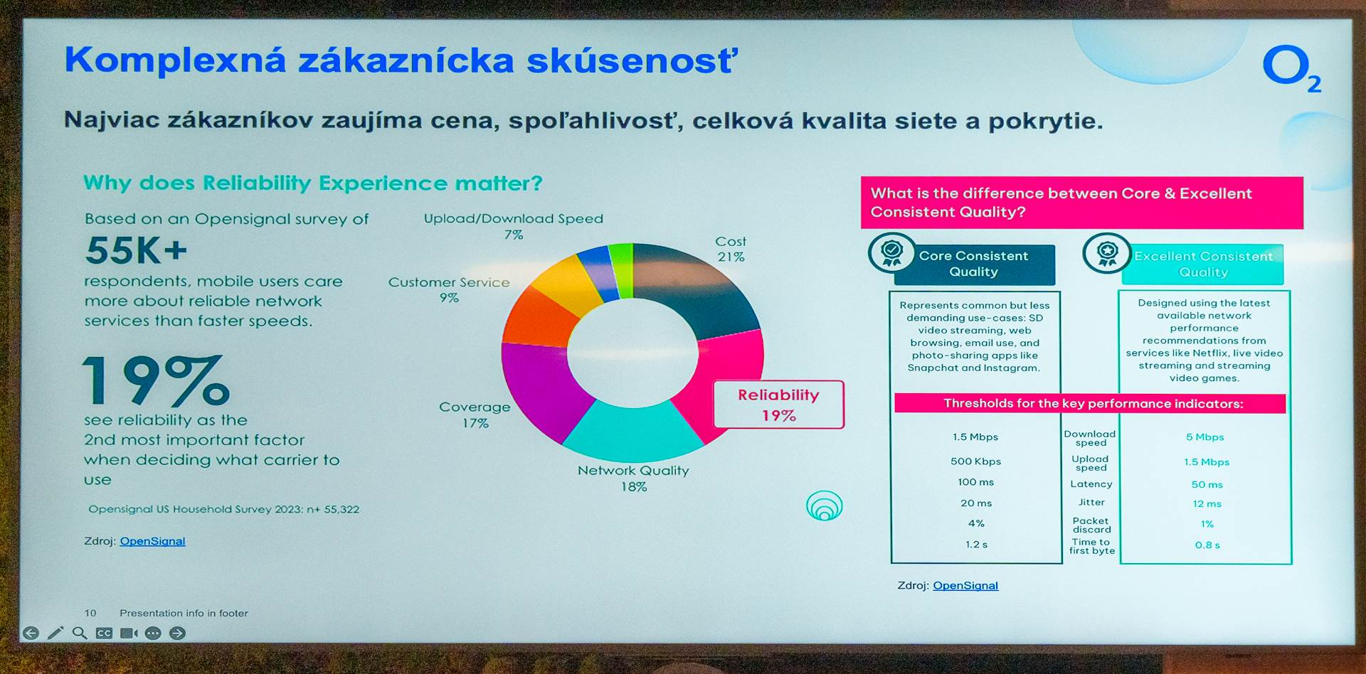 O2 predstavilo aj podrobnejšie analýzy komplexnej zákazníckej skúsenosti. Pre až 21 % zákazníkov je dôležitá cena, ktorú platia svojmu operátorovi, ale hneď na druhom mieste je spoľahlivosť siete. Zákazníci chcú mať istotu, že sa dovolajú, pripoja na internet a realizujú presne to, čo v danej chvíli potrebujú. Za excelentnú kvalitu ľudia považujú download rýchlosťou minimálne 5 Mbit/s, upload dát rýchlosťou minimálne 1,5 Mbit/s a latenciu menej ako 50 ms.
