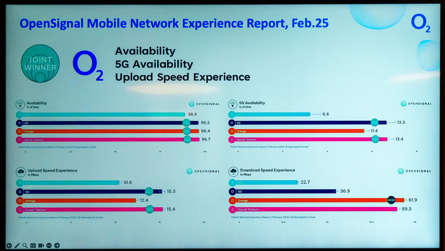 Spoločnosť OpenSignal vo svojich nezávislých meraniach potvrdila, že O2 už teraz patrí medzi troch lídrov na trhu. Konkrétne je to v rýchlosti odosielania dát, dostupnosti siete a dostupnosti technológie 5G. OpenSignal ocenil sieť O2 v rebríčkoch 5G Voice App Experience, 5G Global Leader a 5G Gaming Experience. Zaujímavé je potom aktuálne hodnotenie parametra Download, kde O2 aktuálne zaostáva za vedúcou dvojicou. Výborné výsledky však dosahuje O2 v parametri Upload.