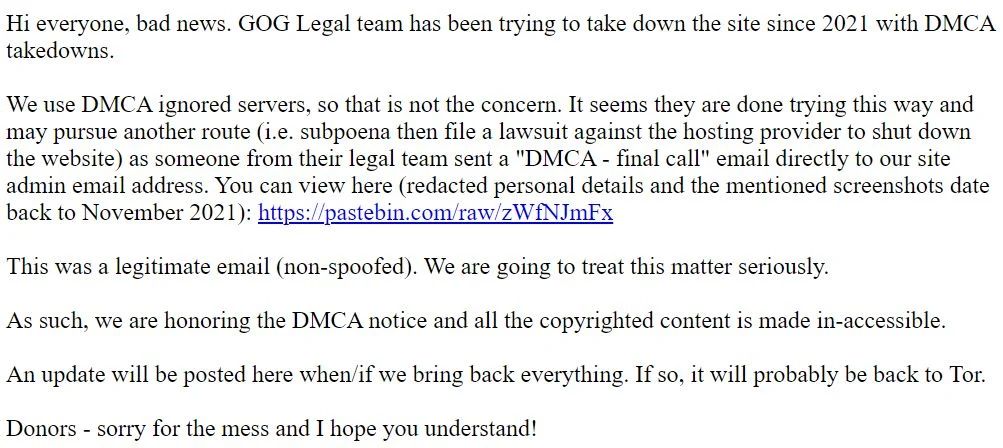 Poliaci sa snažia stránku vypnúť od roku 2011. Ich právny tím poslal výzvu, ktorú odoslal hostingovej spoločnosti. Vo výzve sa uvádza, že sú „mimoriadne odhodlaný zrušiť predmetnú stránku“ a požiadali hosting o vynaloženie úsilia v tejto súvislosti. Právne oddelenie poľskej firmy oznámilo, že GOG-Games stiahli svoju stránku dobrovoľne, keďže nakoniec by ich vinou mohol prísť k žalobnej ujme aj poskytovateľ hostingového priestoru.